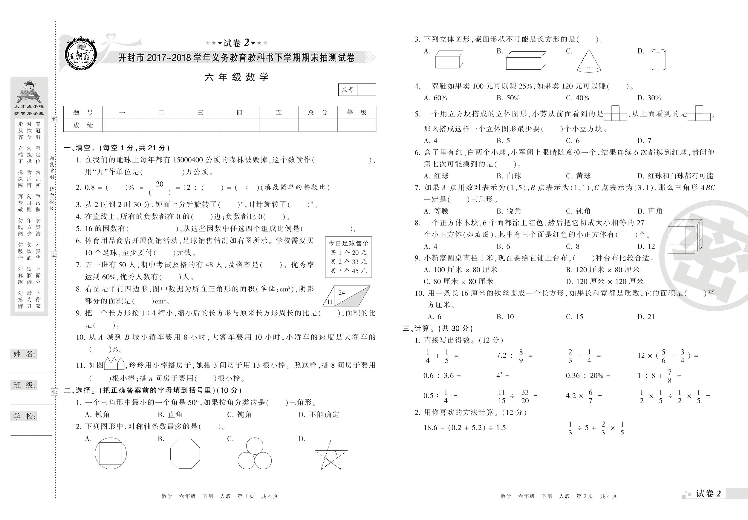 2017-2018学年第二学期开封市六年级数学试卷(人教版)【2】