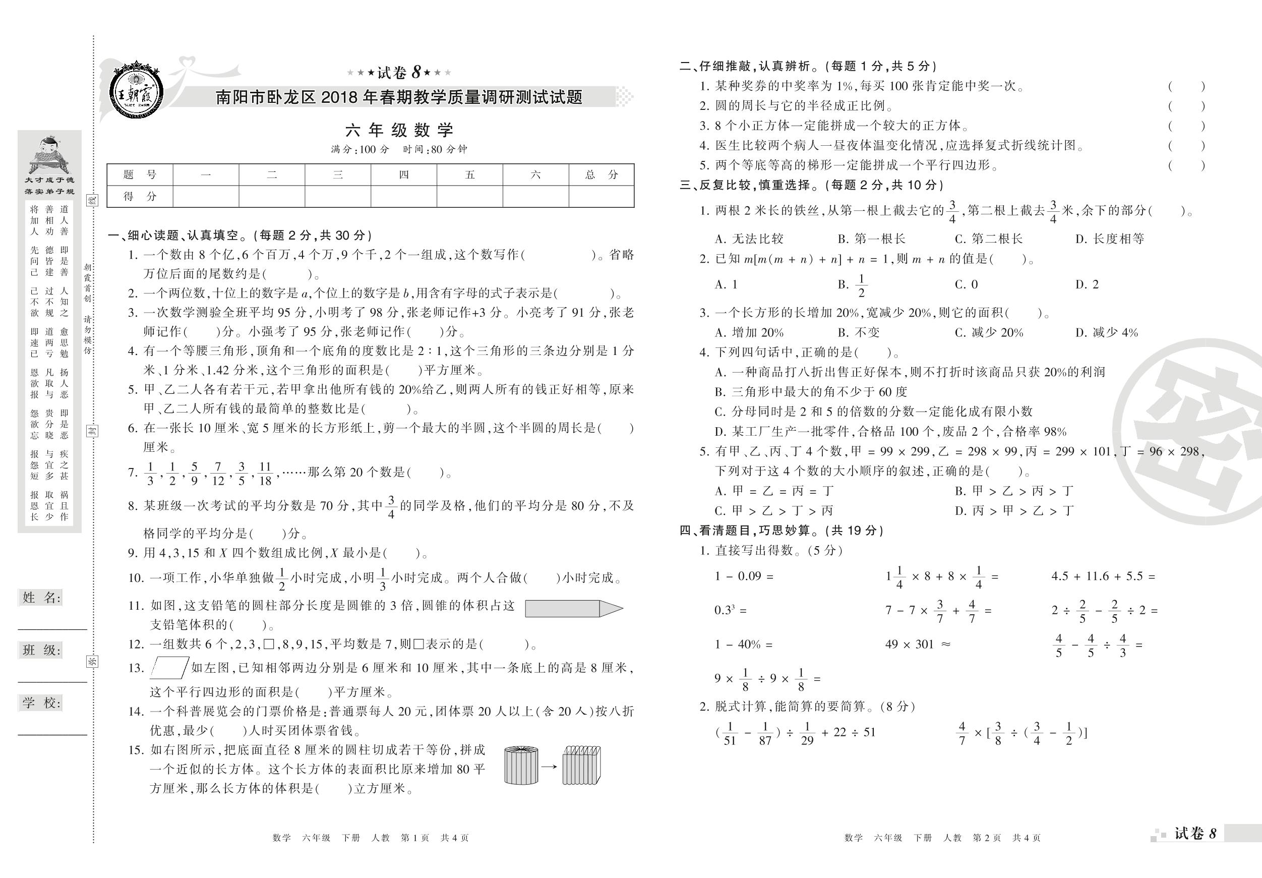2017-2018学年第二学期南阳市卧龙区六年级数学试卷(人教版)【8】