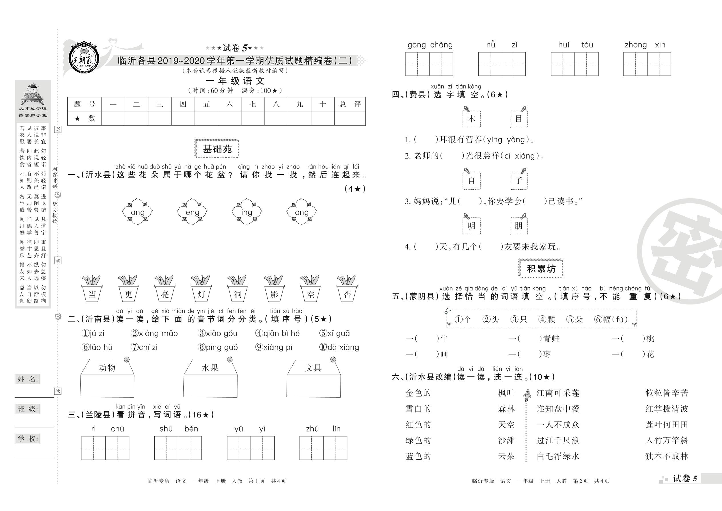 一年级语文人教版上册期末卷