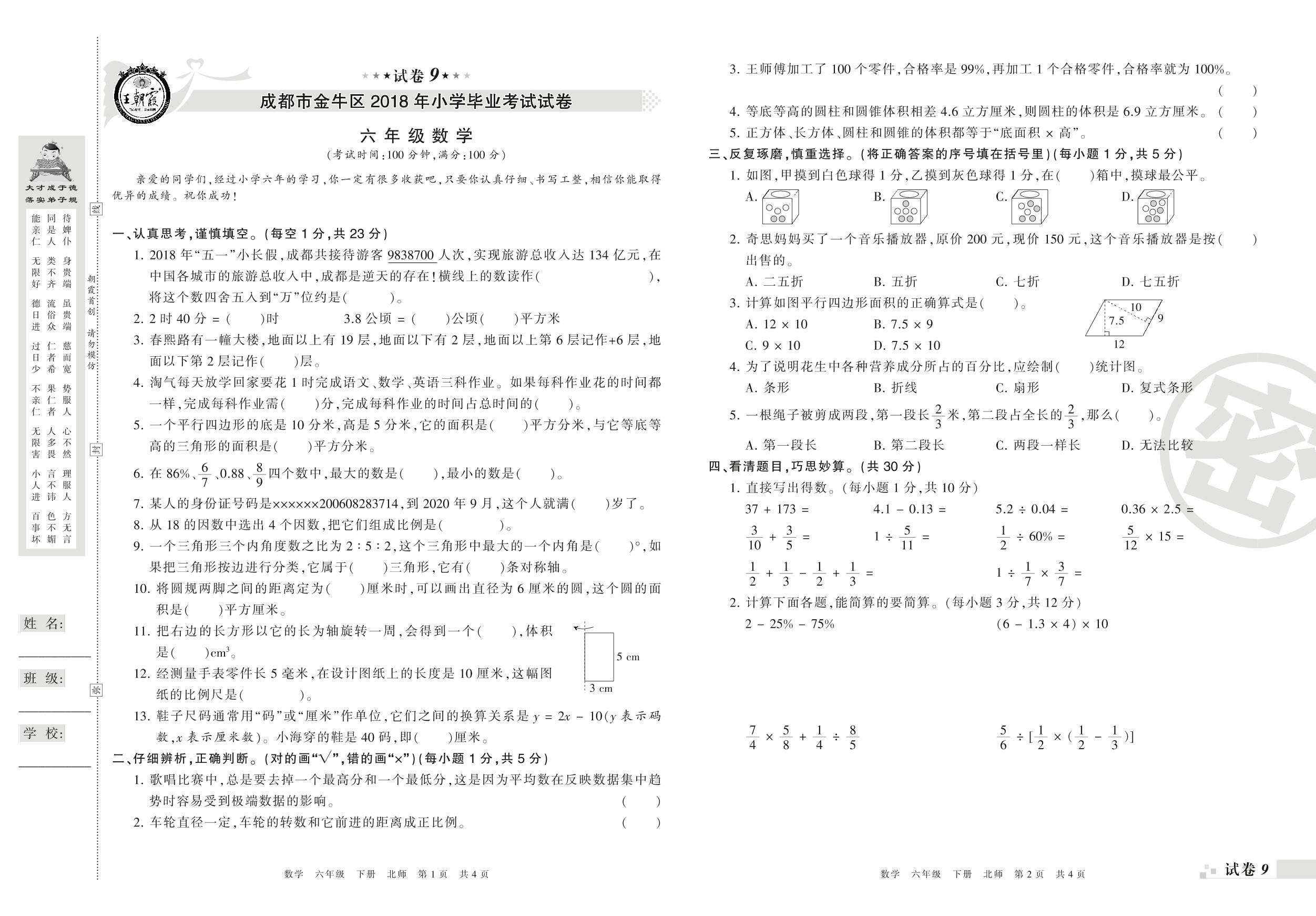 2017-2018学年第二学期成都市金牛区六年级数学试卷(北师版)【9】