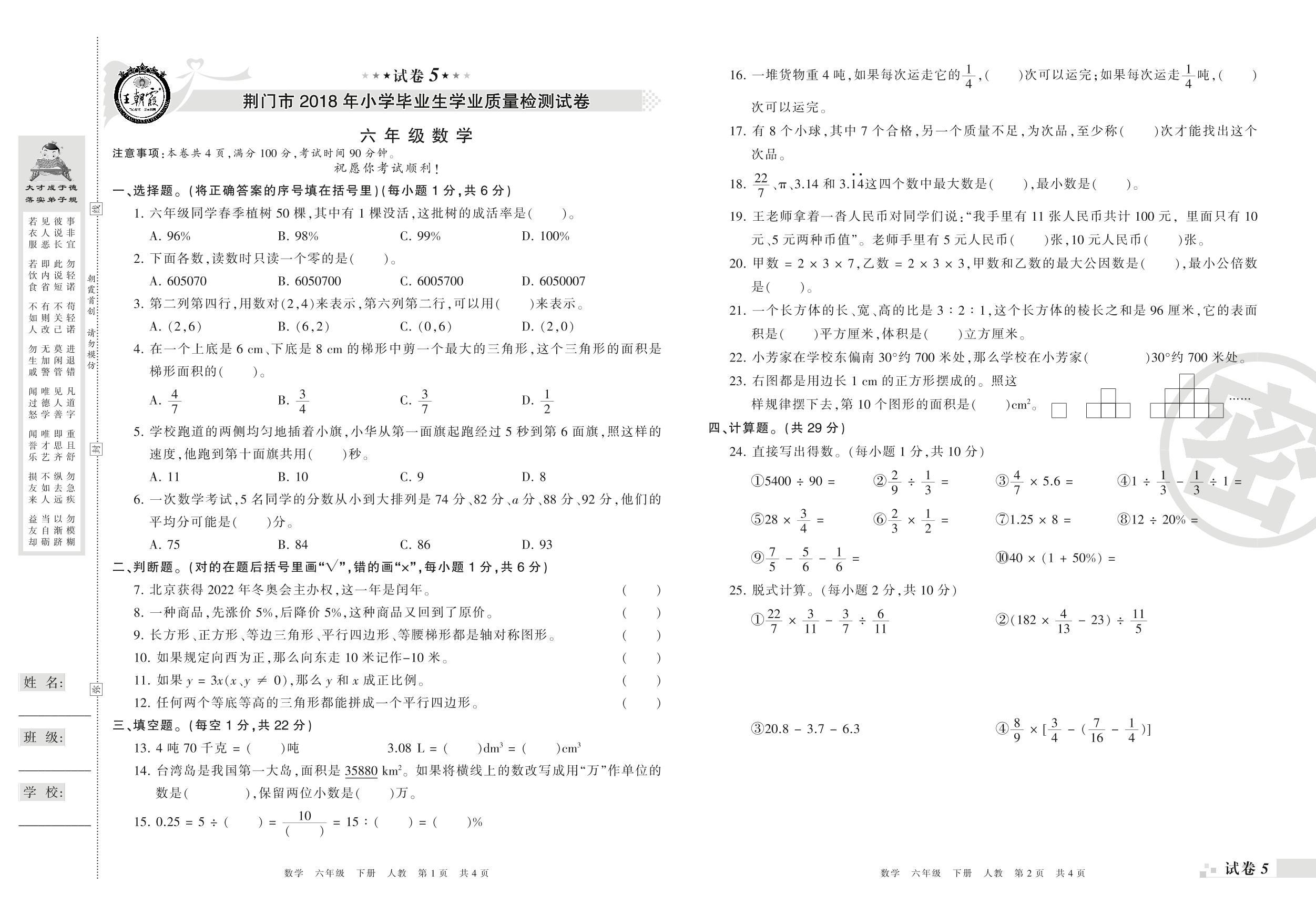 2017-2018学年第二学期荆门市六年级数学试卷(人教版)【5】