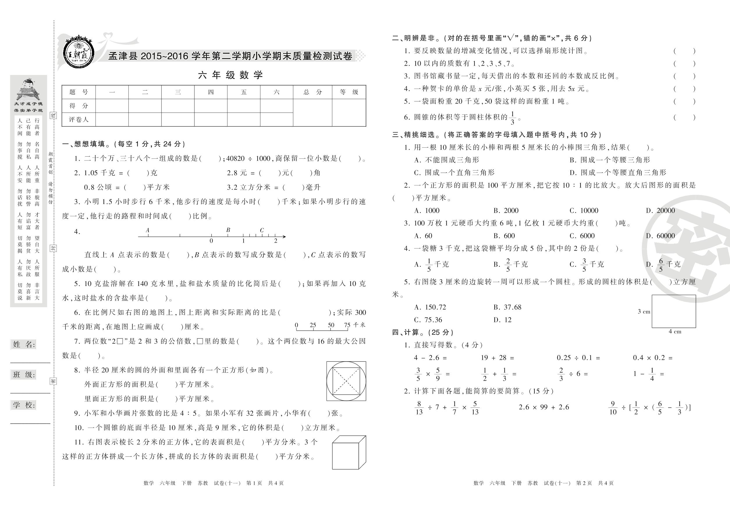 2015-2016学年第二学期洛阳市孟津县六年级数学试卷(苏教版)【11】