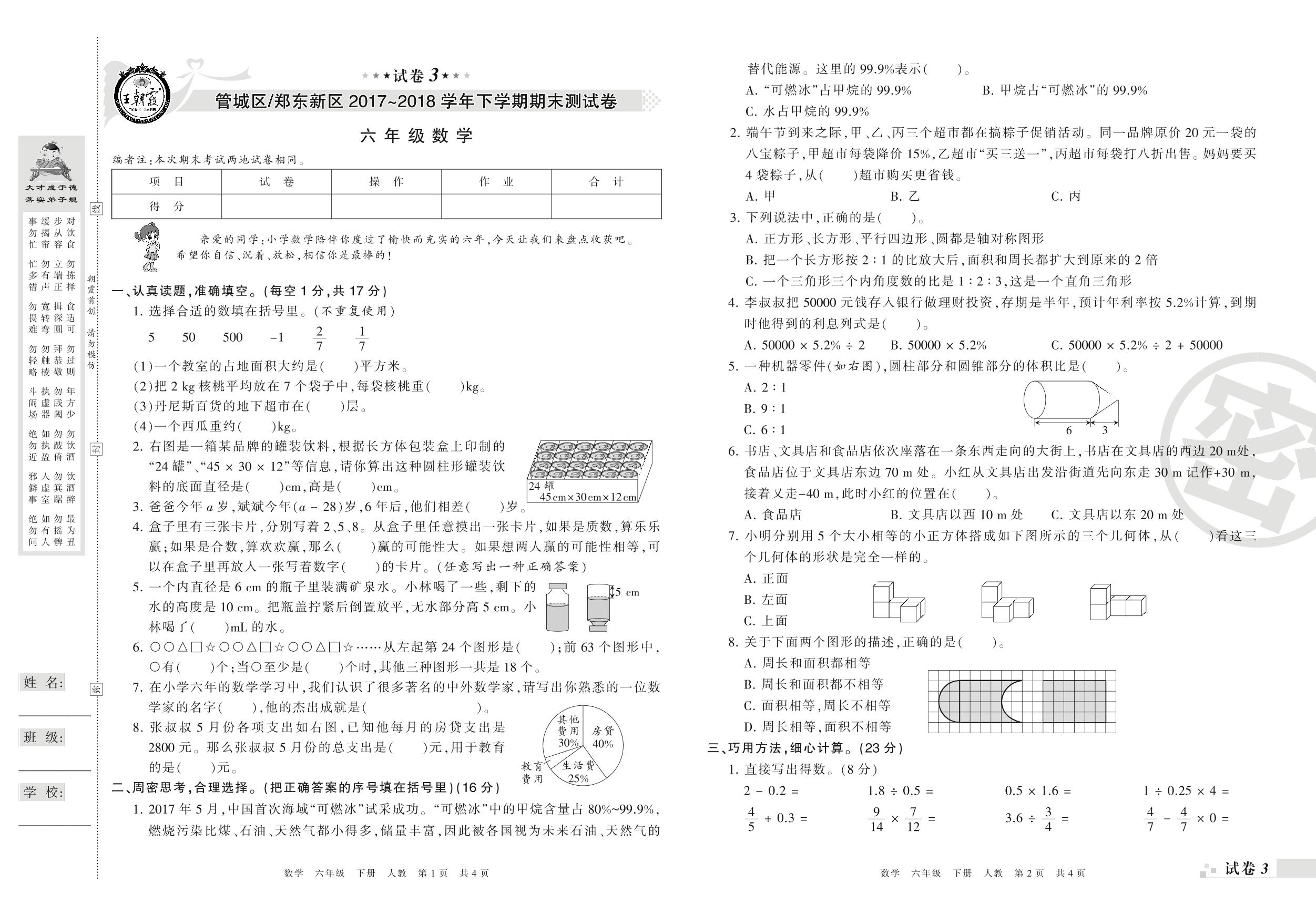 2017-2018学年第二学期郑州市管城区、郑东新区六年级数学试卷(人教版)【3】