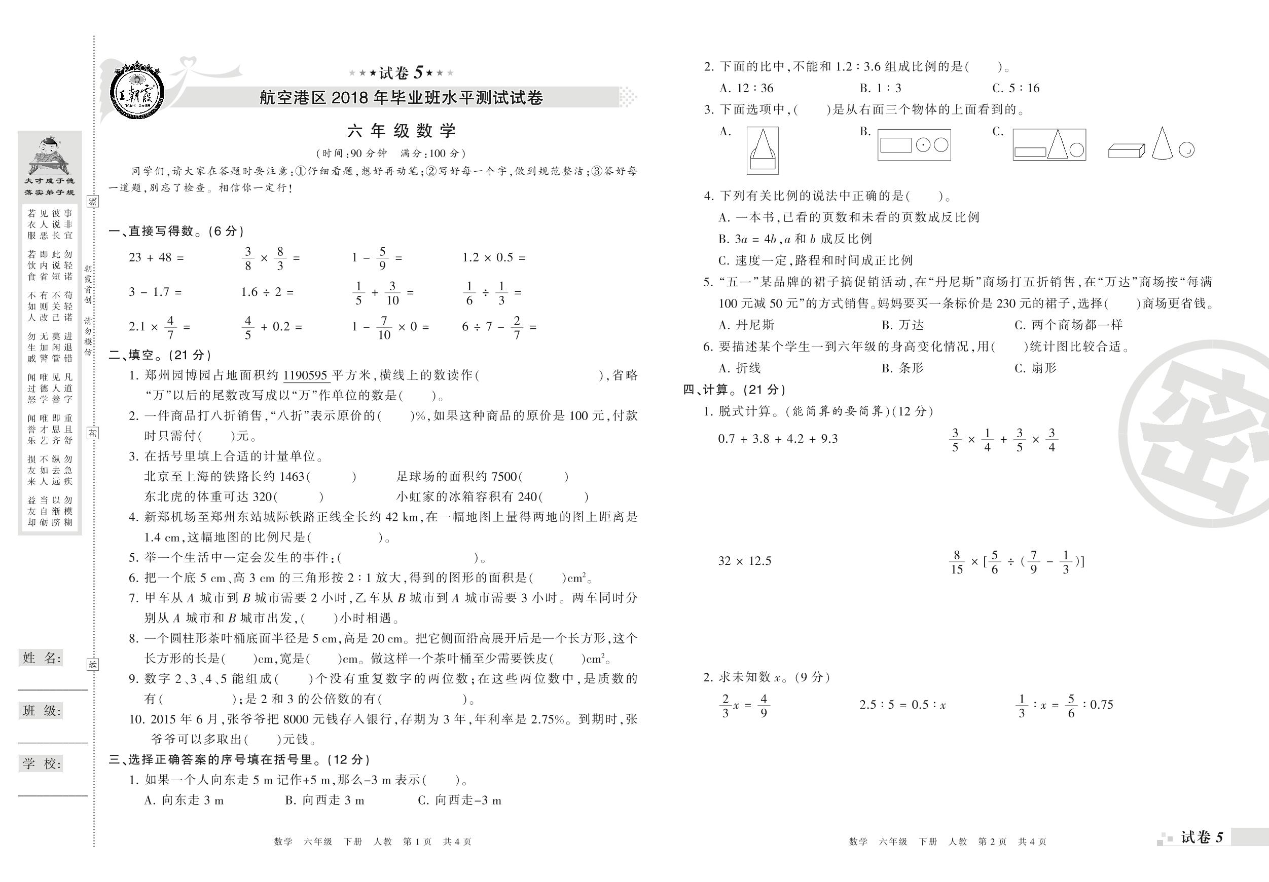 2017-2018学年第二学期郑州市航空港区六年级数学试卷(人教版)【5】