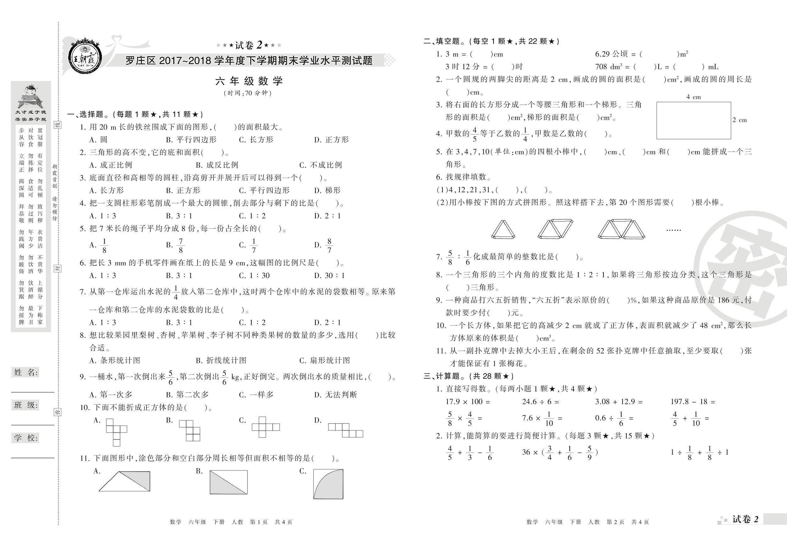 2017-2018学年第二学期临沂市罗庄区六年级数学试卷(人教版)【2】