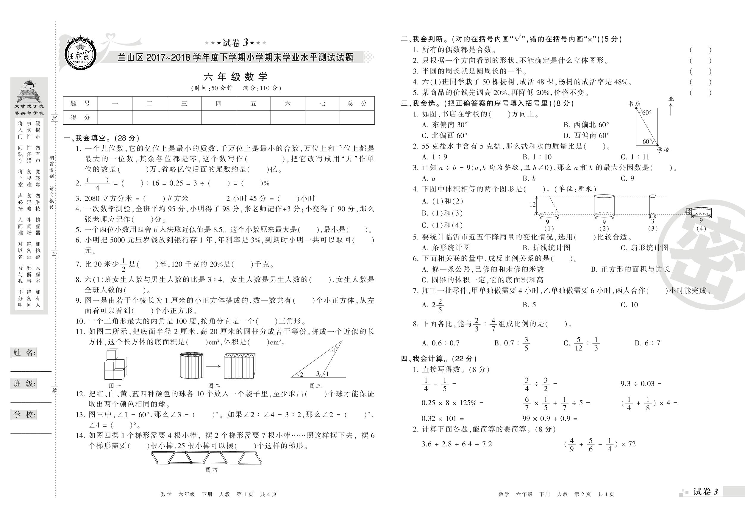 2017-2018学年第二学期临沂市兰山区六年级数学试卷(人教版)【3】