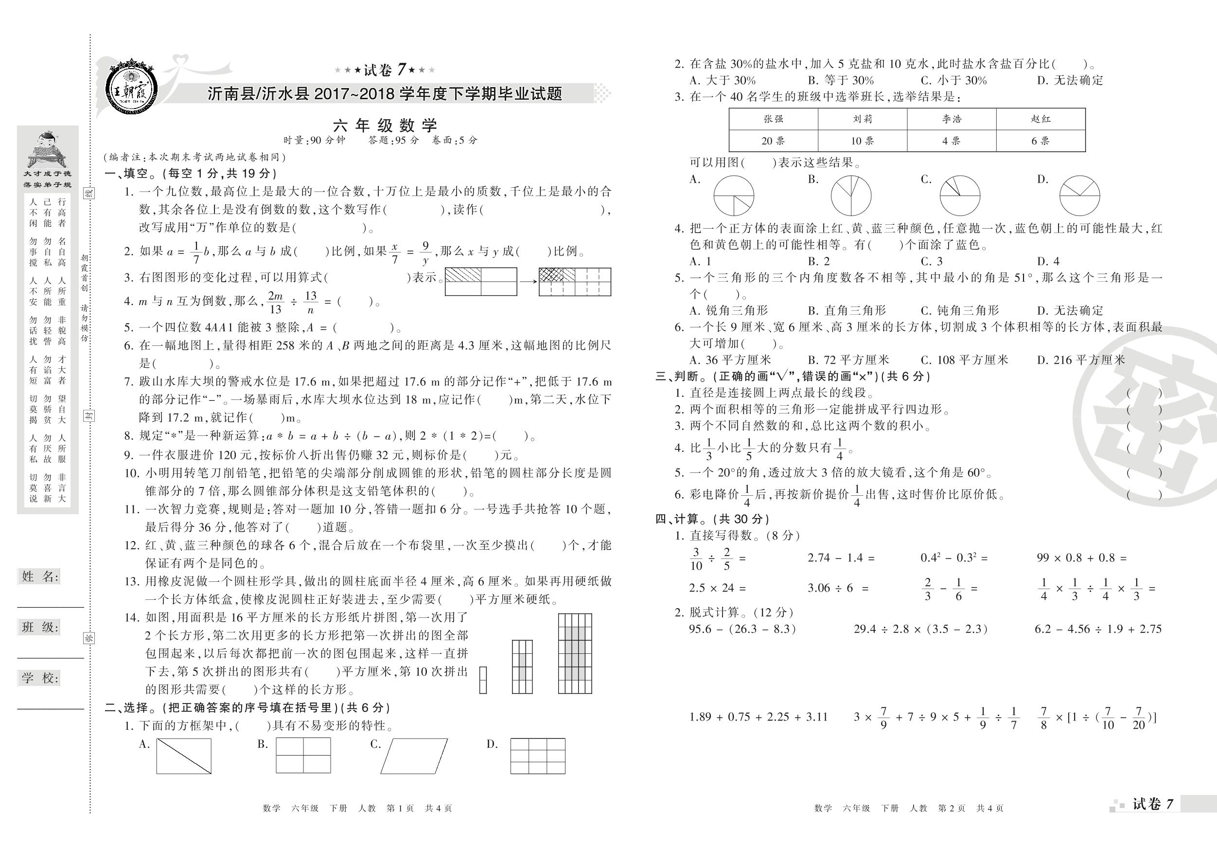 2017-2018学年第二学期临沂市沂南县、沂水县六年级数学试卷(人教版)【7】