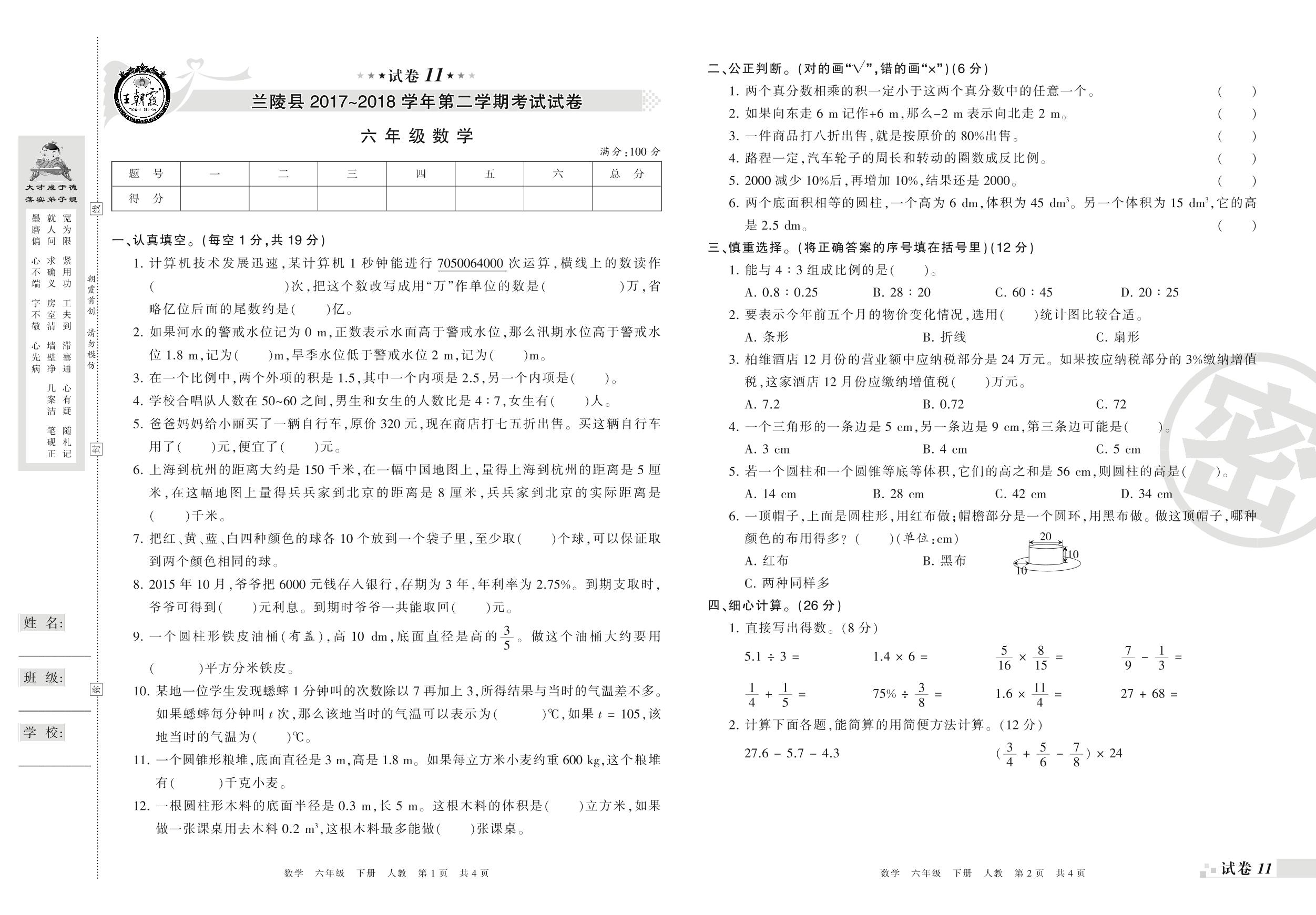 2017-2018学年第二学期临沂市兰陵县六年级数学试卷(人教版)【11】