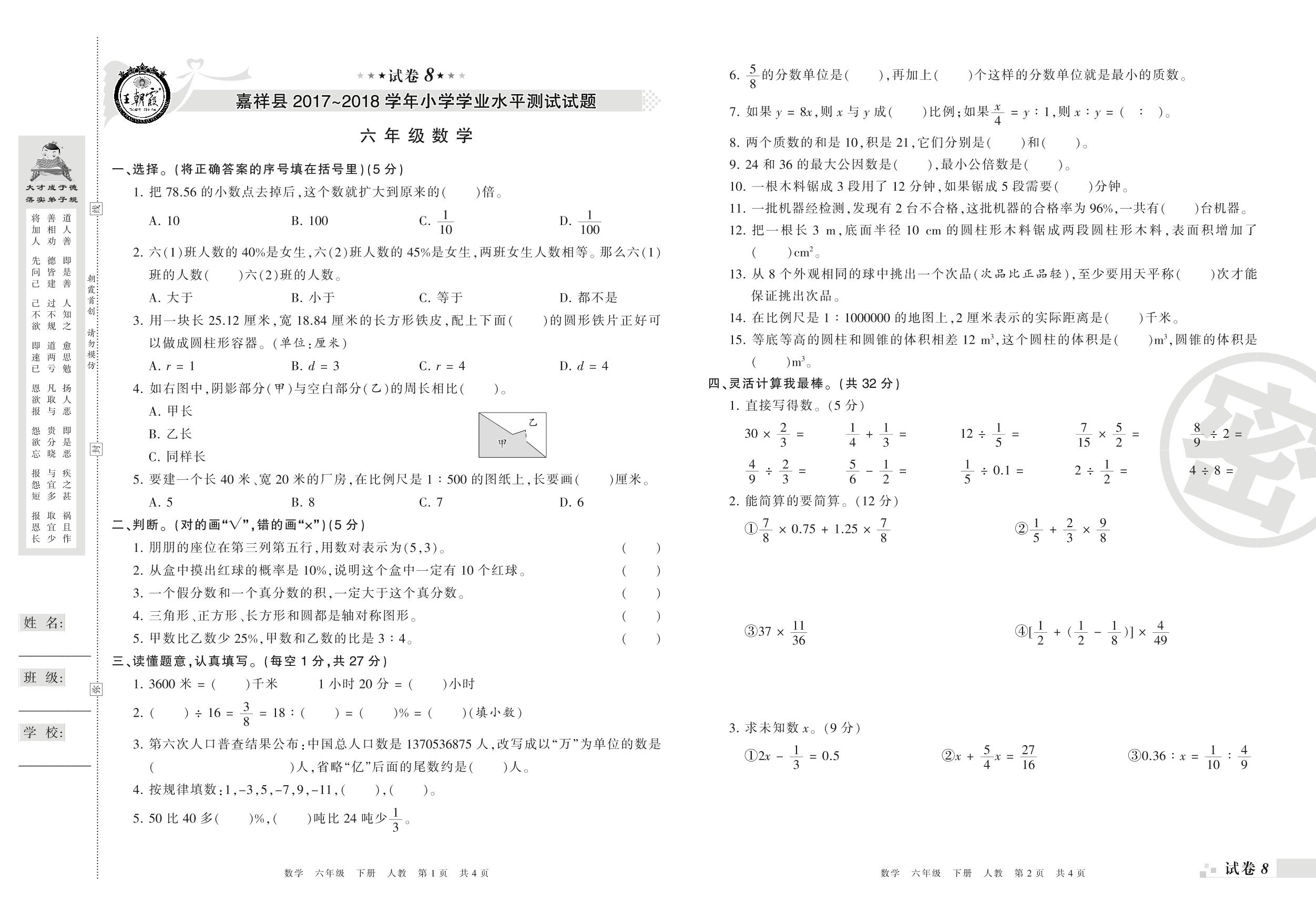 2017-2018学年第二学期济宁市嘉祥县六年级数学试卷(人教版)【8】