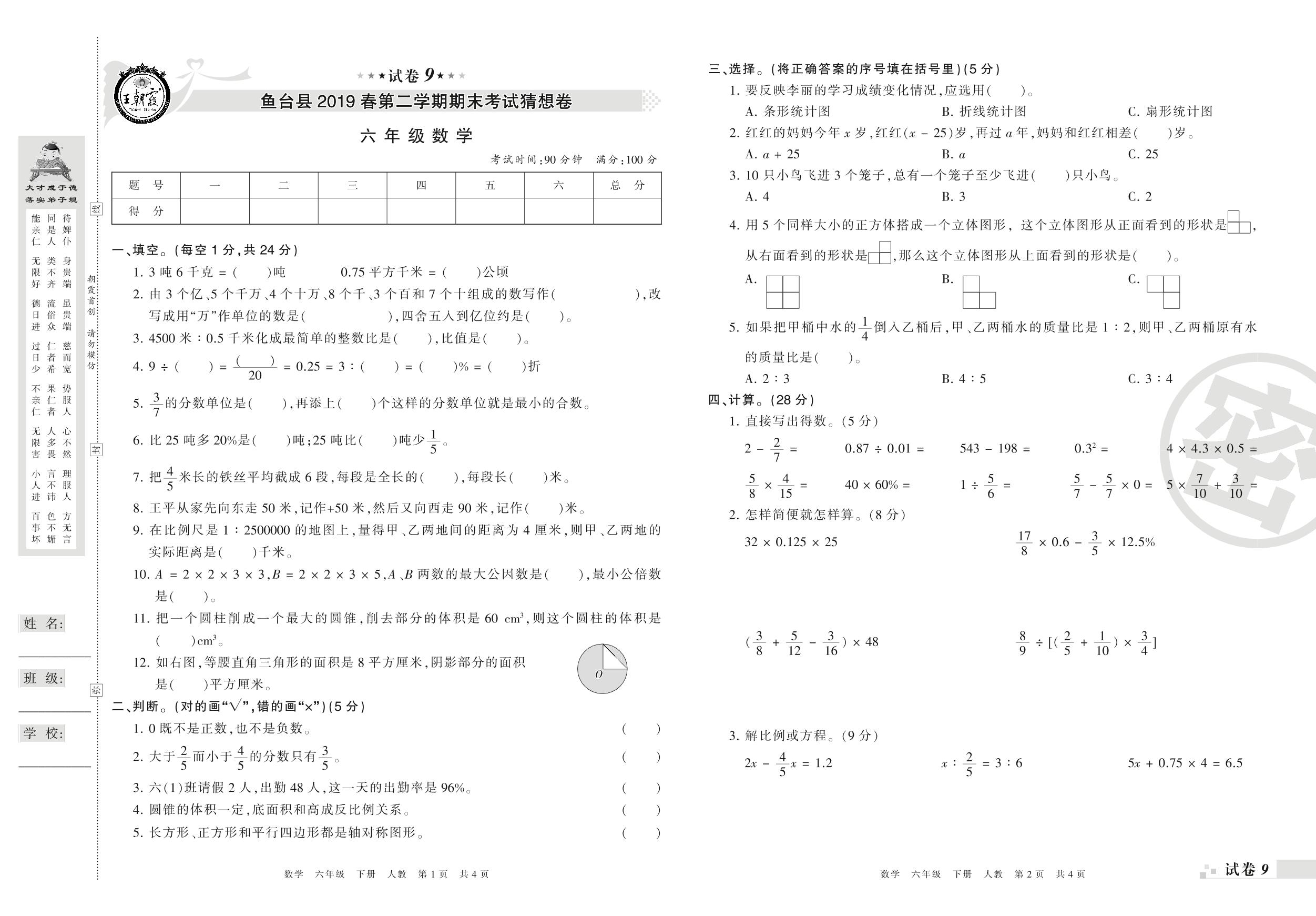 2018-2019学年第二学期济宁市鱼台县猜想卷六年级数学试卷(人教版)【9】