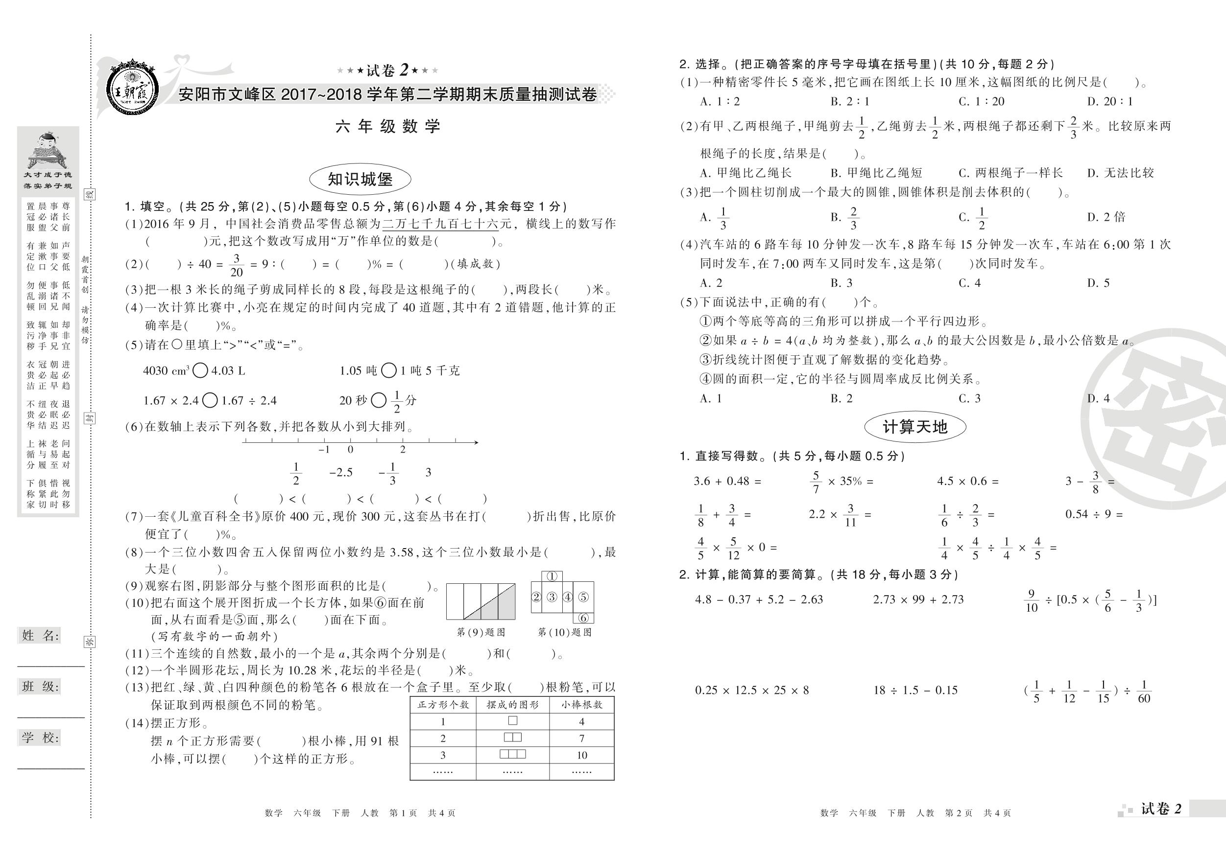 2017-2018学年第二学期安阳市文峰区六年级数学试卷(人教版)【2】