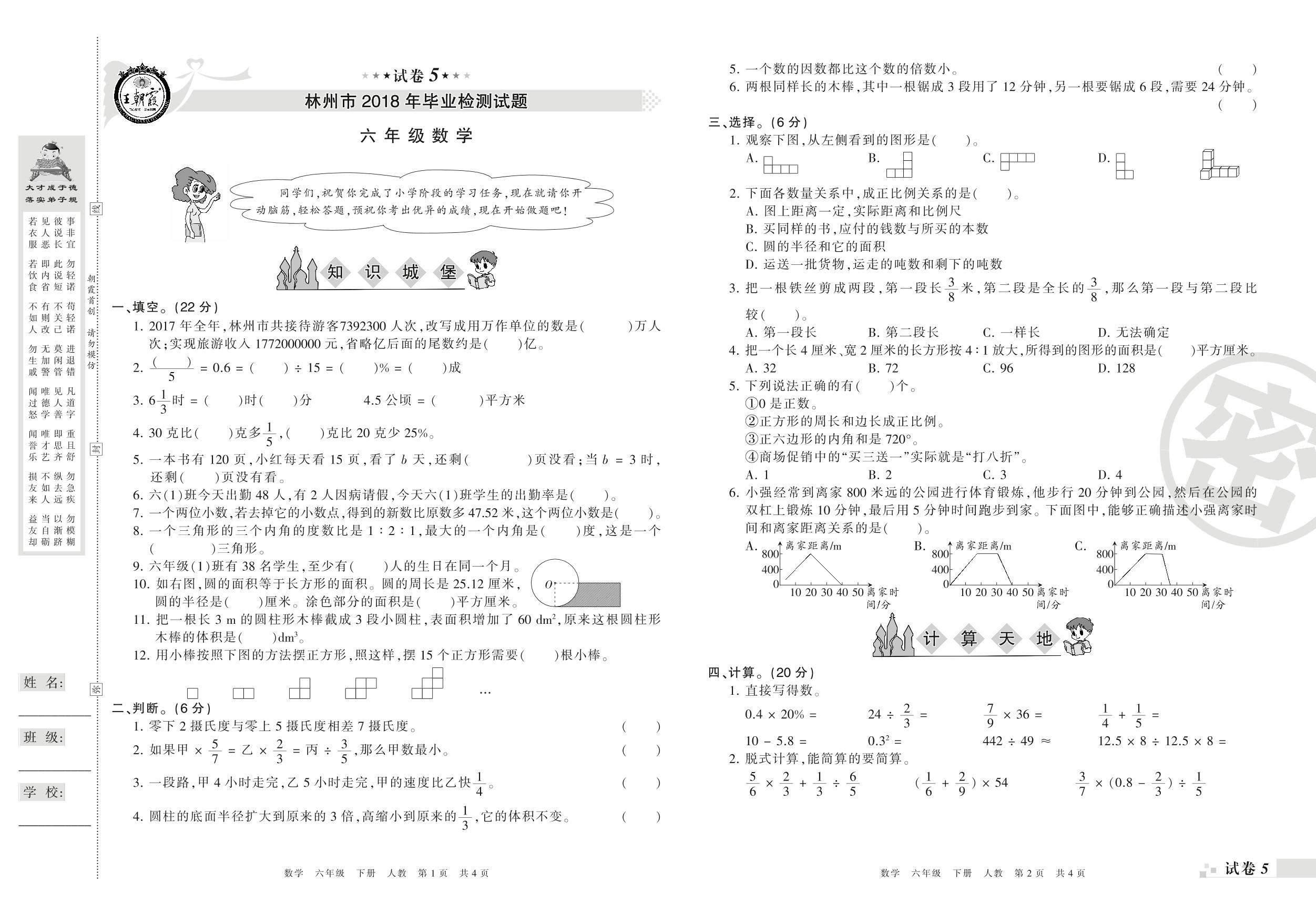 2017-2018学年第二学期林州市六年级数学试卷(人教版)【5】