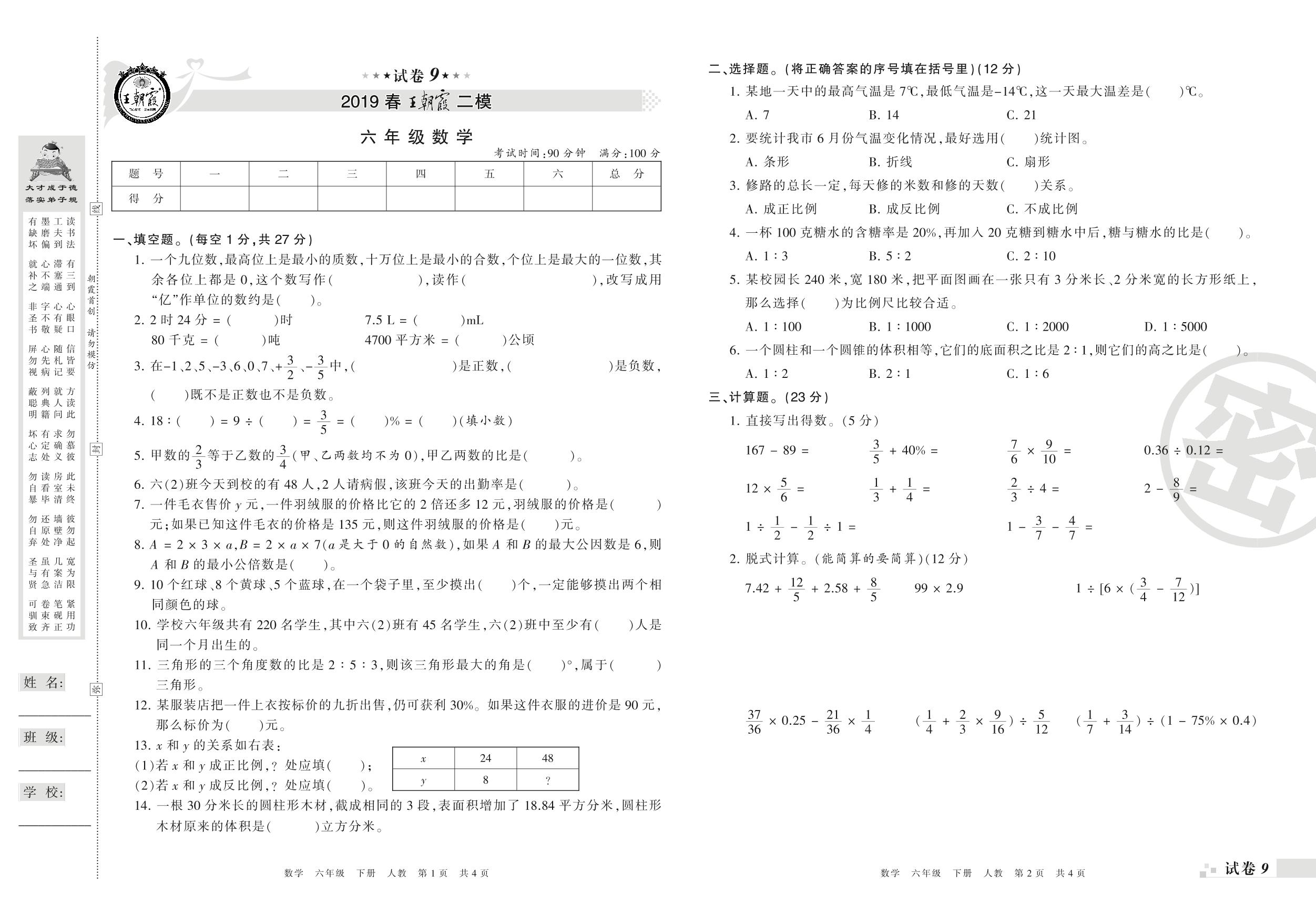 王朝霞期末模拟卷六年级下册数学(人教版)_R210805102443【9】