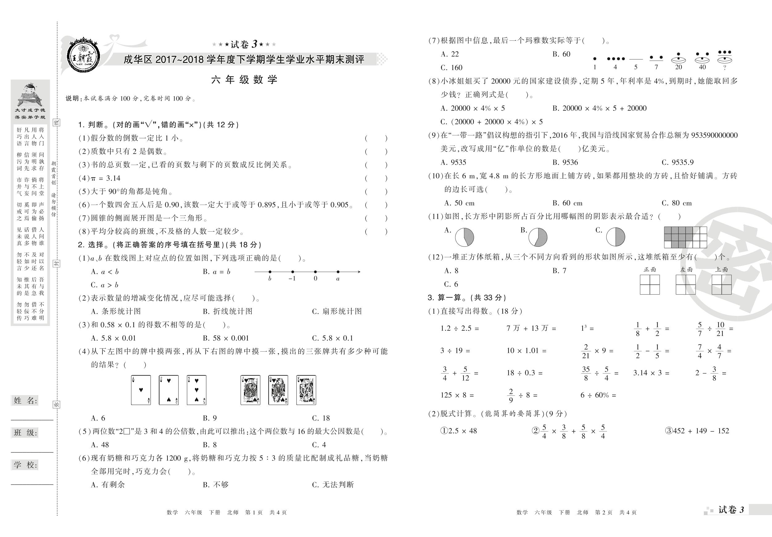 2017-2018学年第二学期成都市成华区六年级数学试卷(北师版)【3】