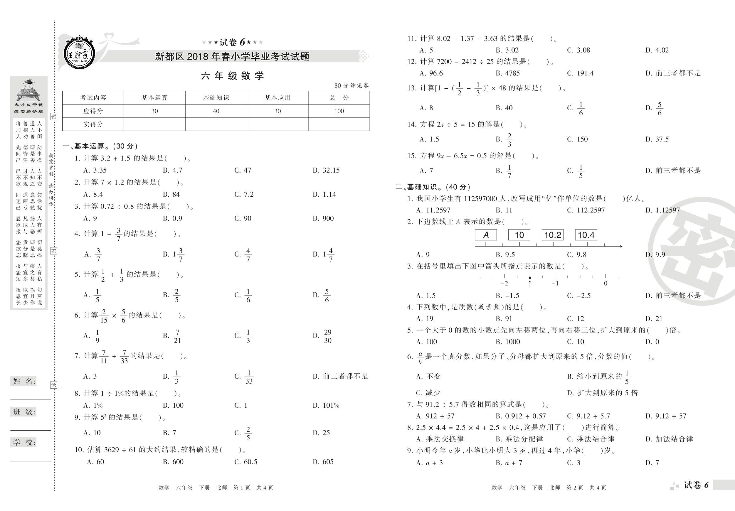 2017-2018学年第二学期成都市新都区六年级数学试卷(北师版)【6】