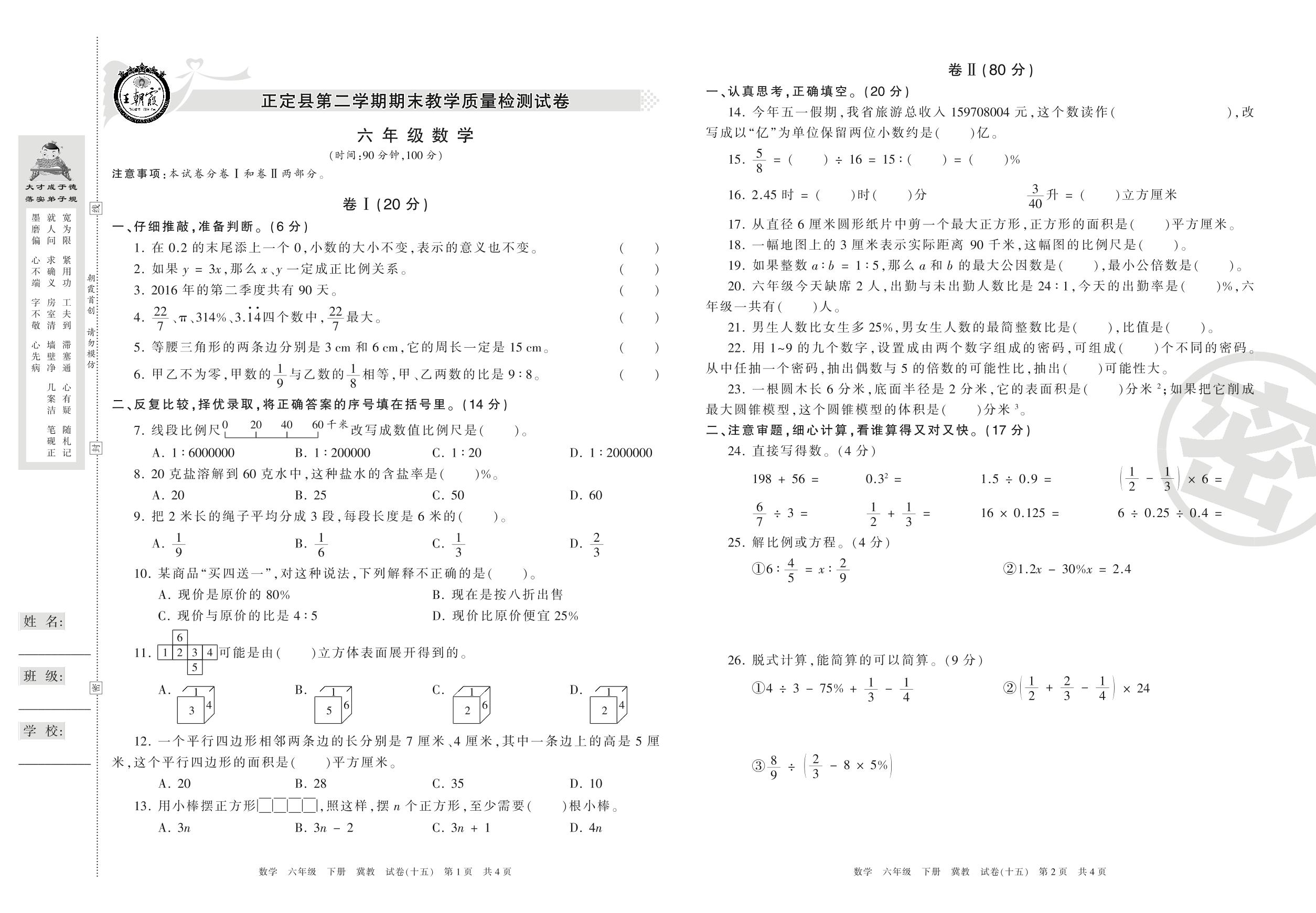 2015-2016学年第二学期石家庄市正定县六年级数学试卷(冀教版)【15】