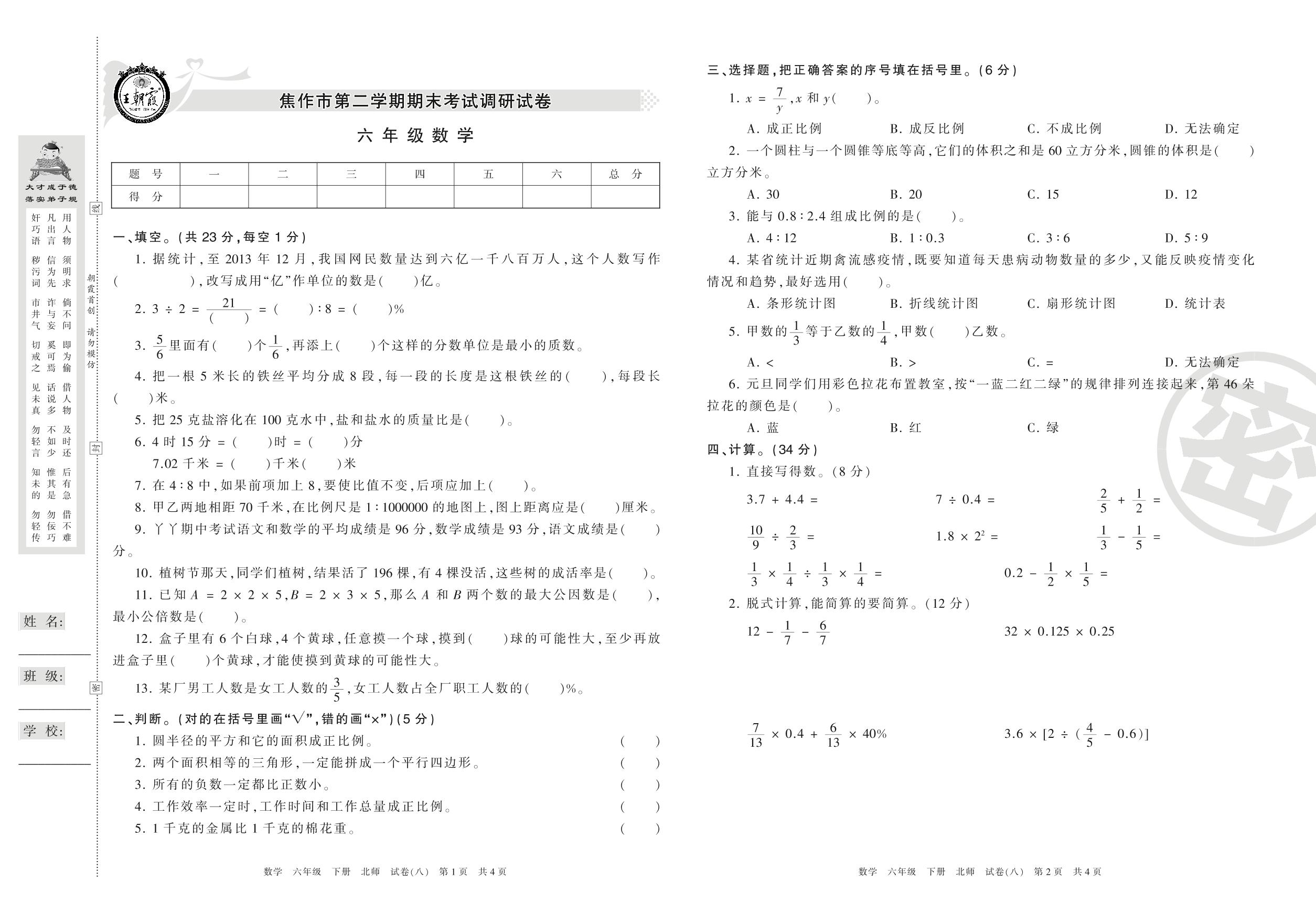 2015-2016学年第二学期焦作市六年级数学试卷(北师版)【8】