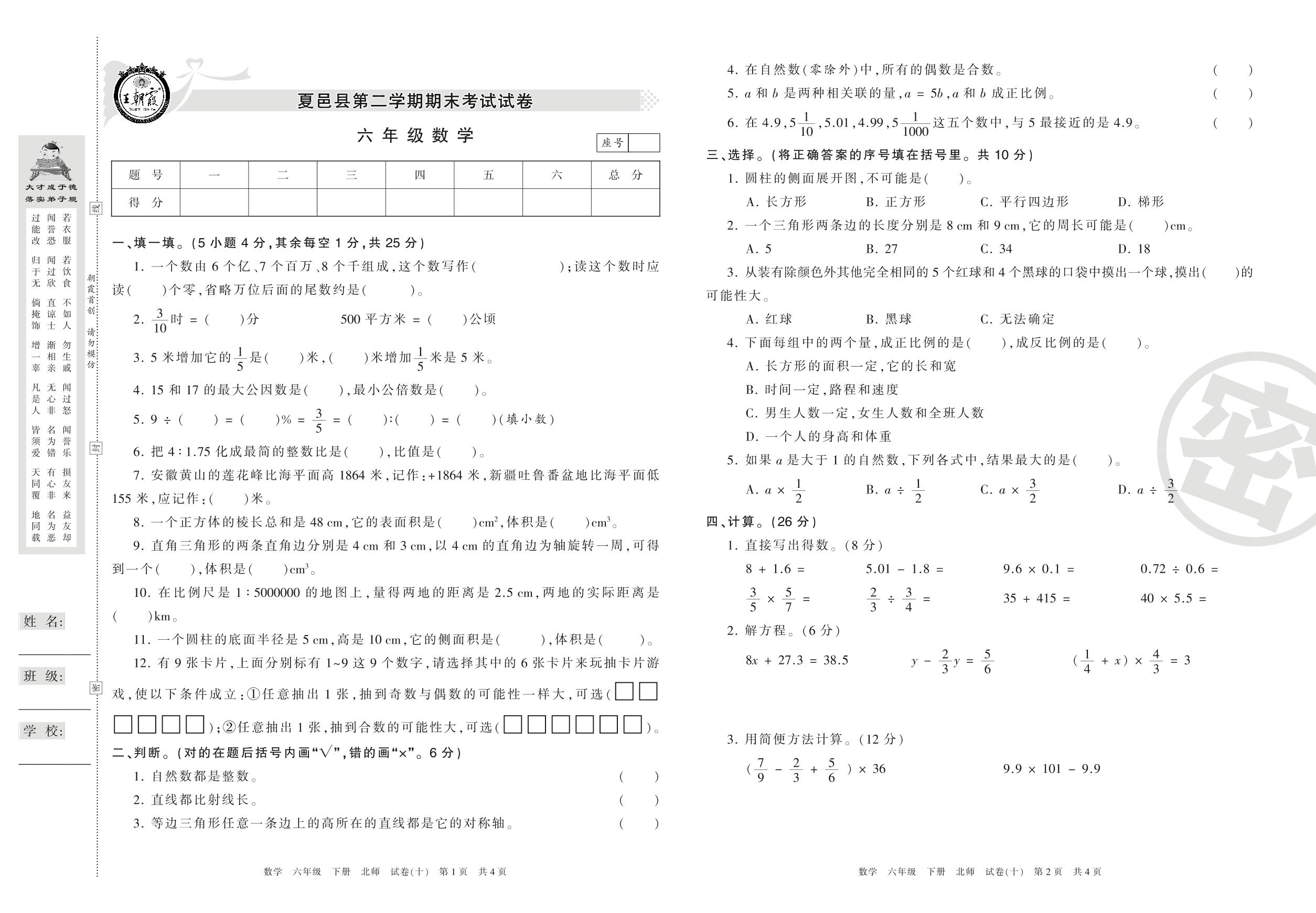 2015-2016学年第二学期商丘市夏邑县六年级数学试卷(北师版)【10】