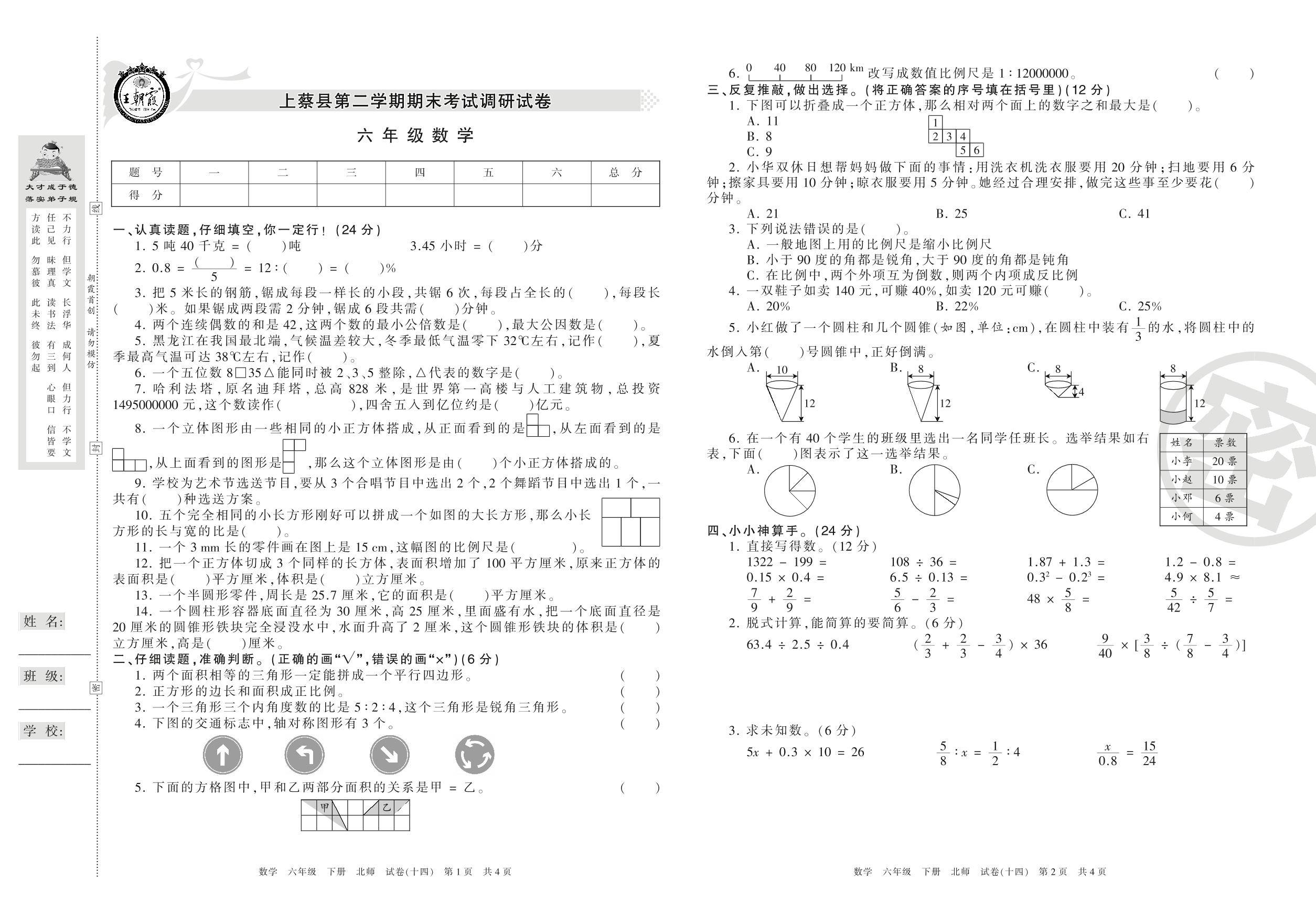 2015-2016学年第二学期驻马店市上蔡县六年级数学试卷(北师版)【14】
