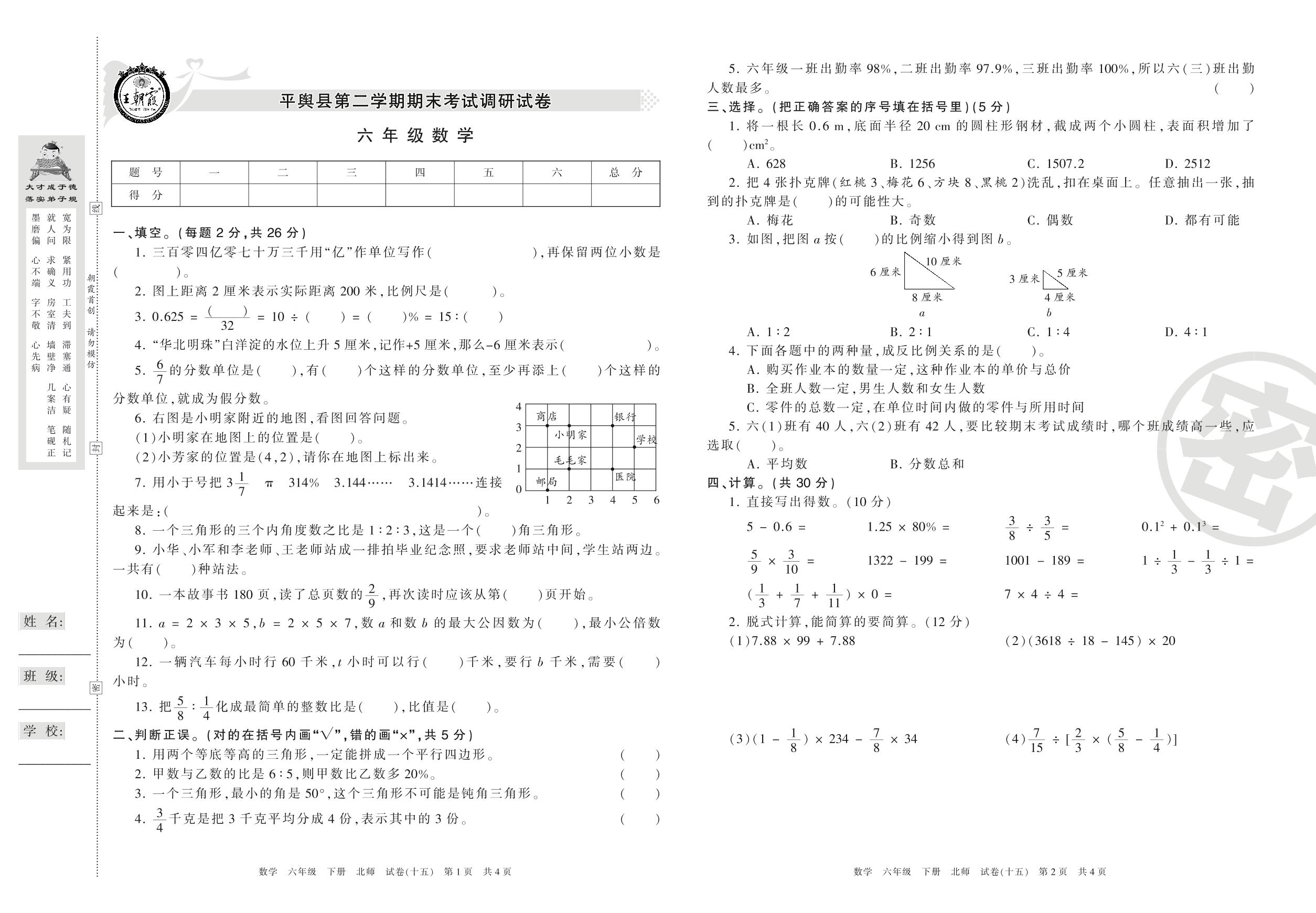 2015-2016学年第二学期驻马店市平舆县六年级数学试卷(北师版)【15】