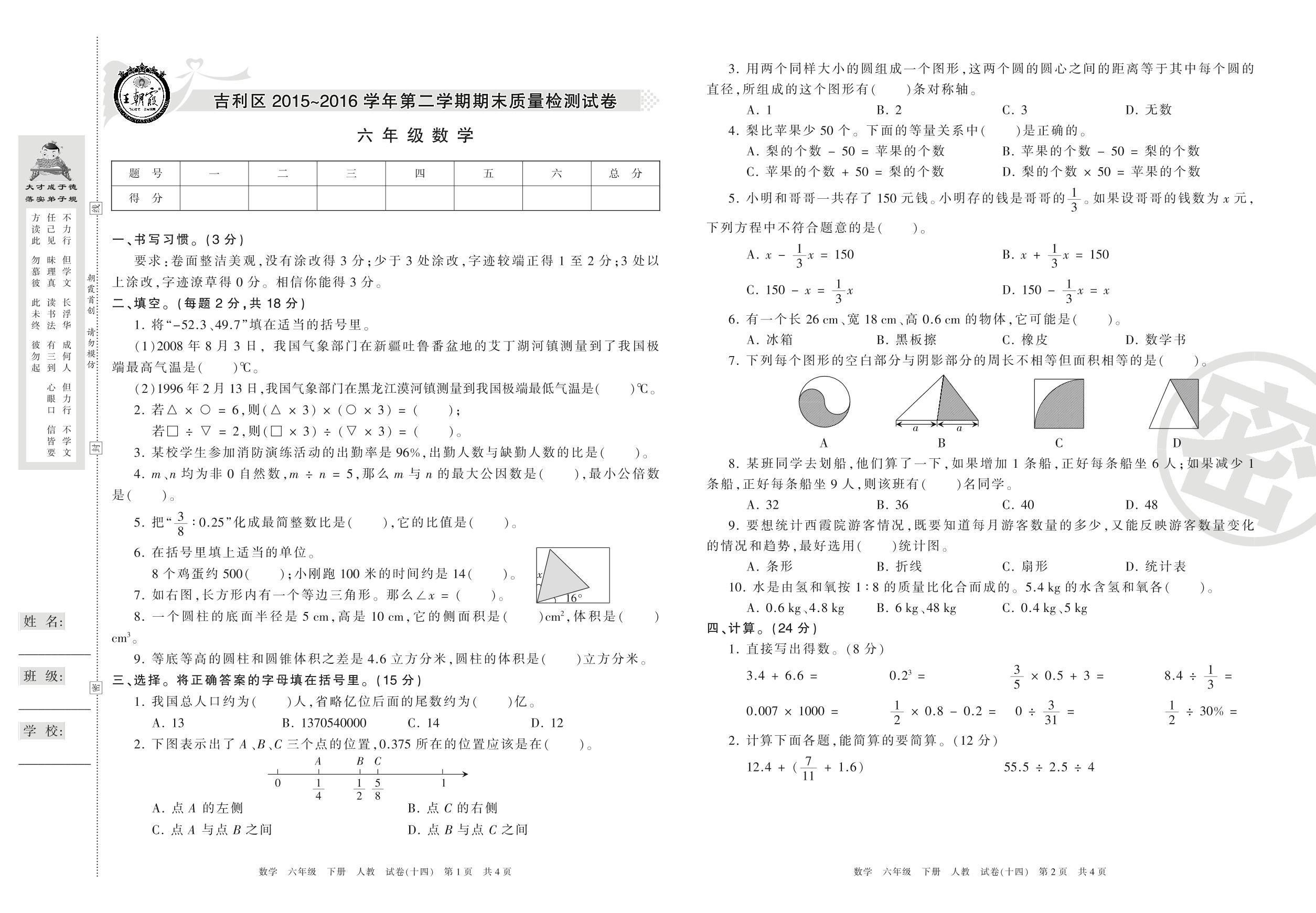 2015-2016学年第二学期洛阳市吉利区六年级数学试卷(人教版)【14】