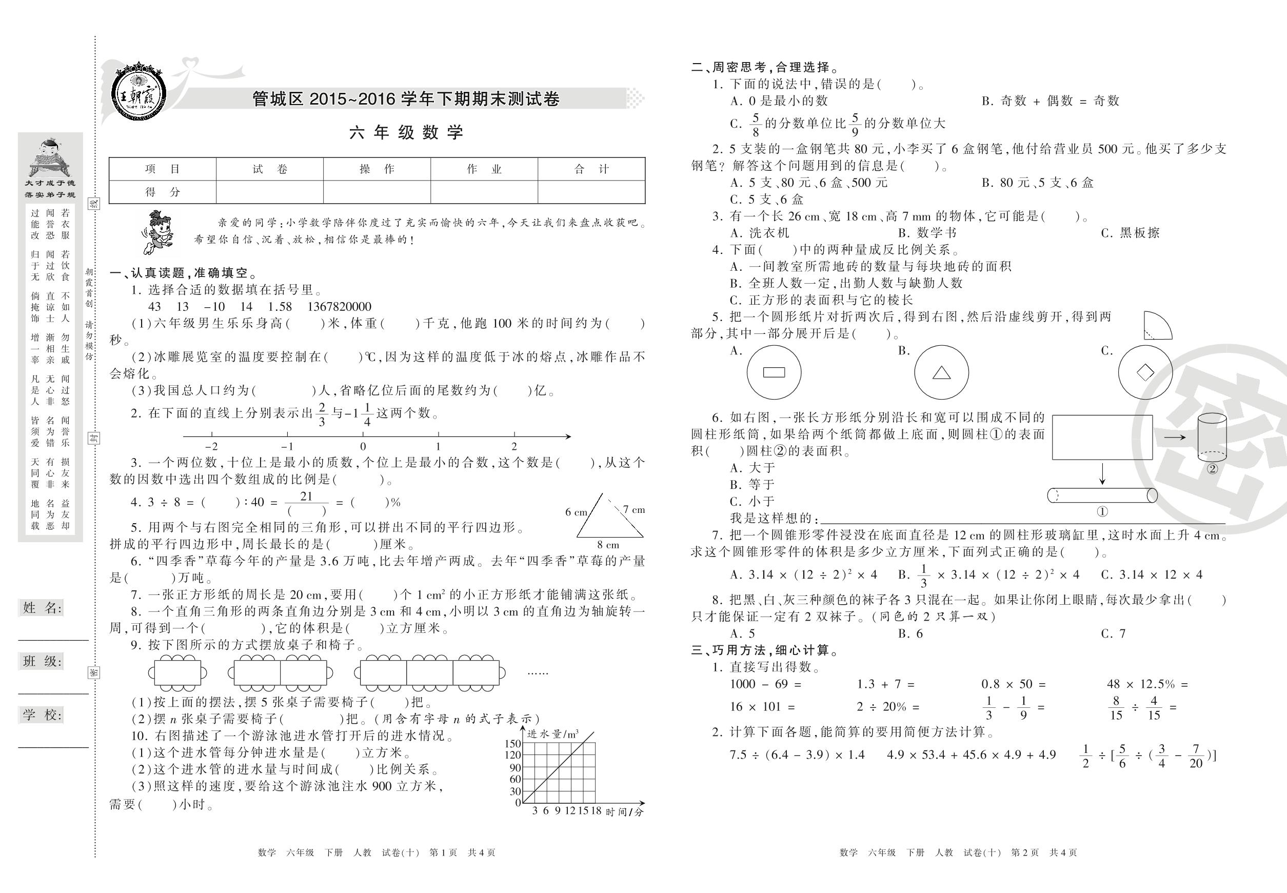 2015-2016学年第二学期郑州市管城区六年级数学试卷(人教版)【10】