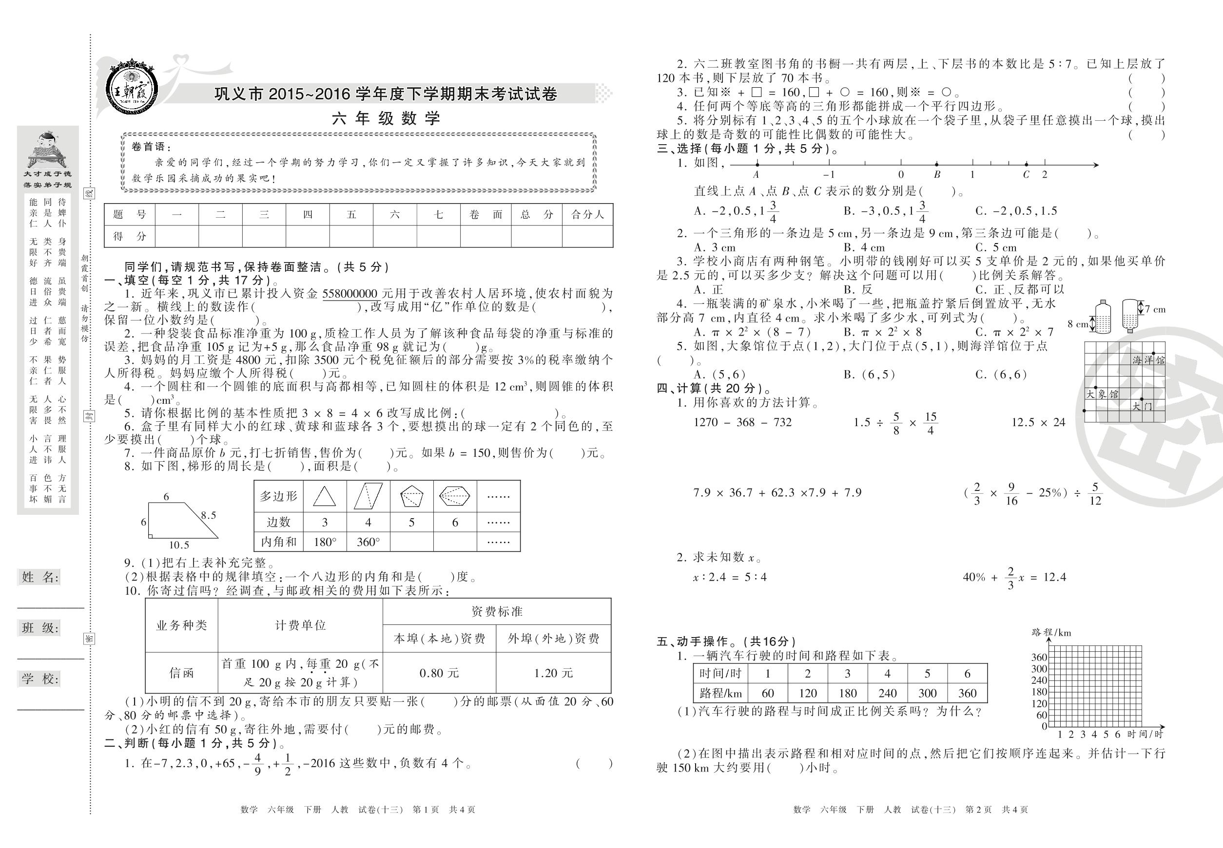 2015-2016学年第二学期巩义市六年级数学试卷(人教版)【13】