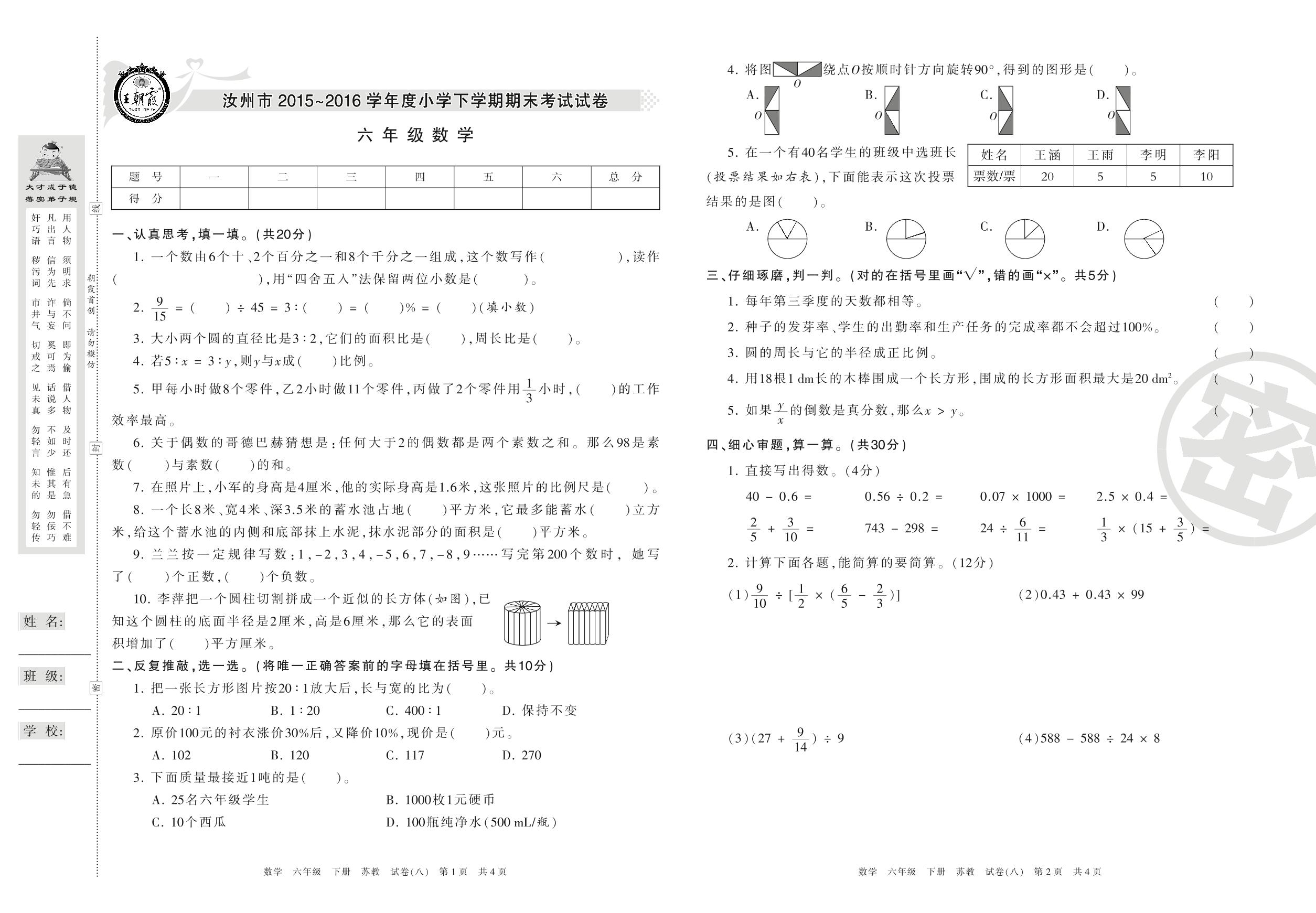 2015-2016学年第二学期汝州市六年级数学试卷(苏教版)【8】