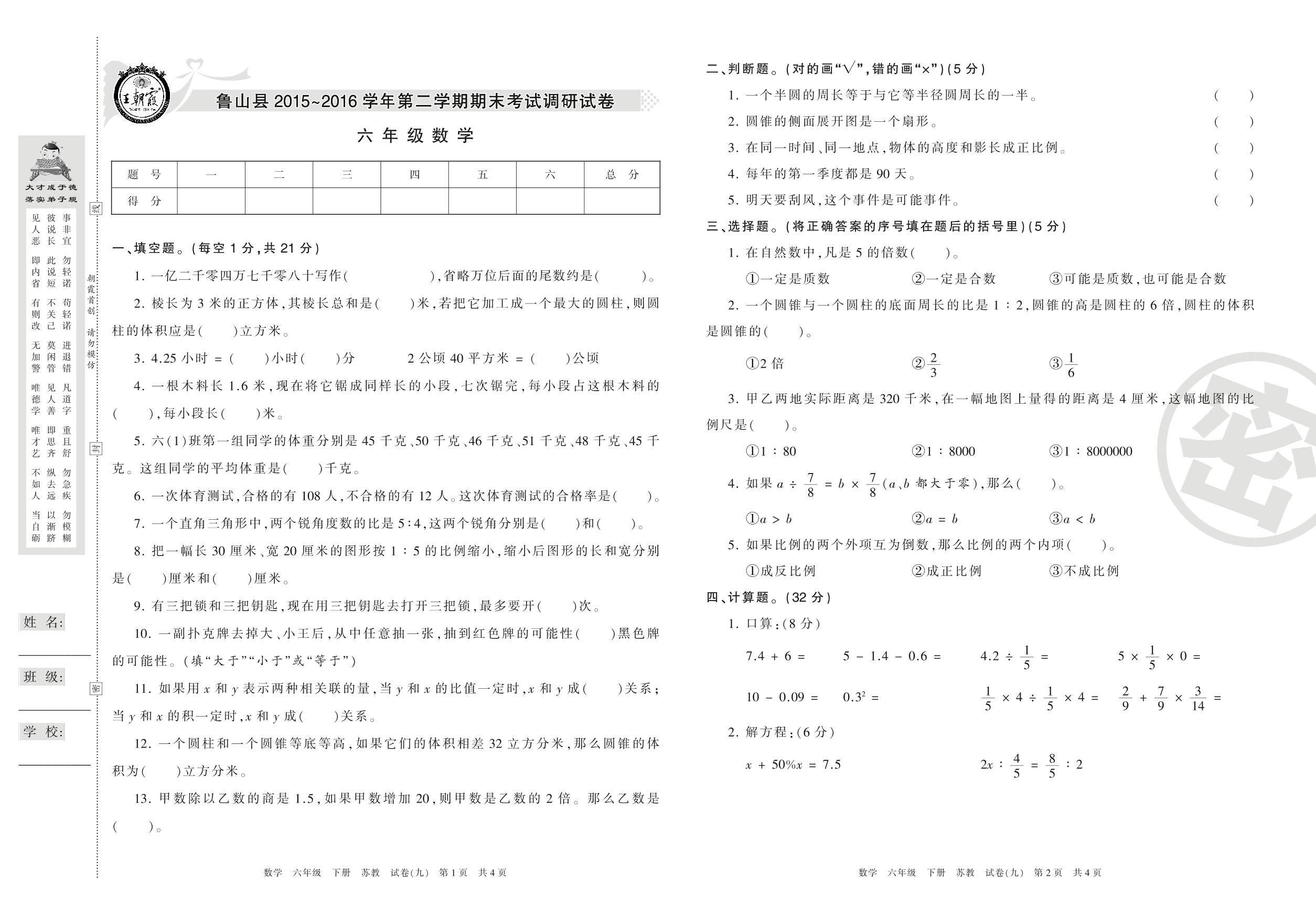 2015-2016学年第二学期平顶山市鲁山县六年级数学试卷(苏教版)【9】