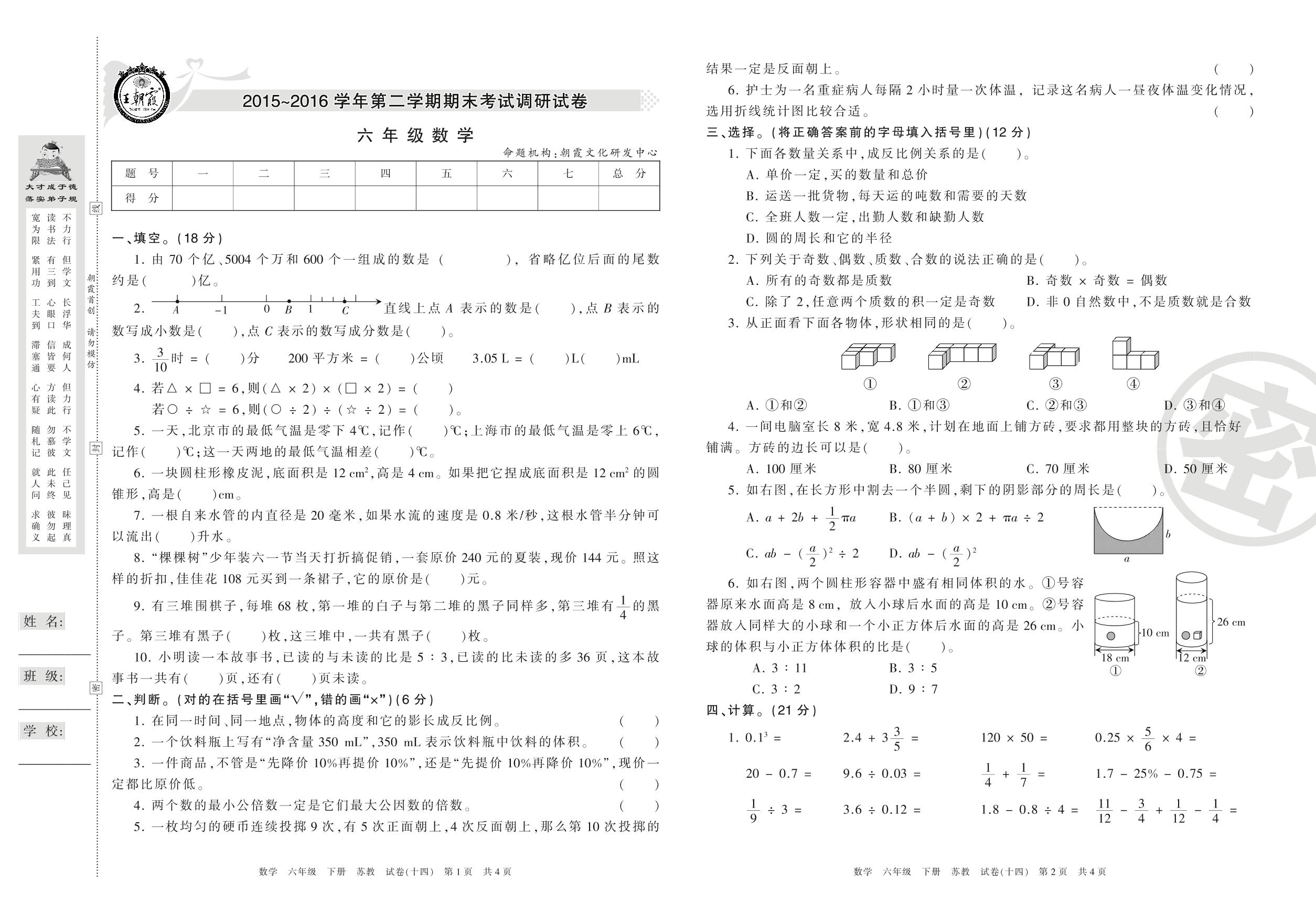 王朝霞期末调研卷六年级下册数学(苏教版)【14】