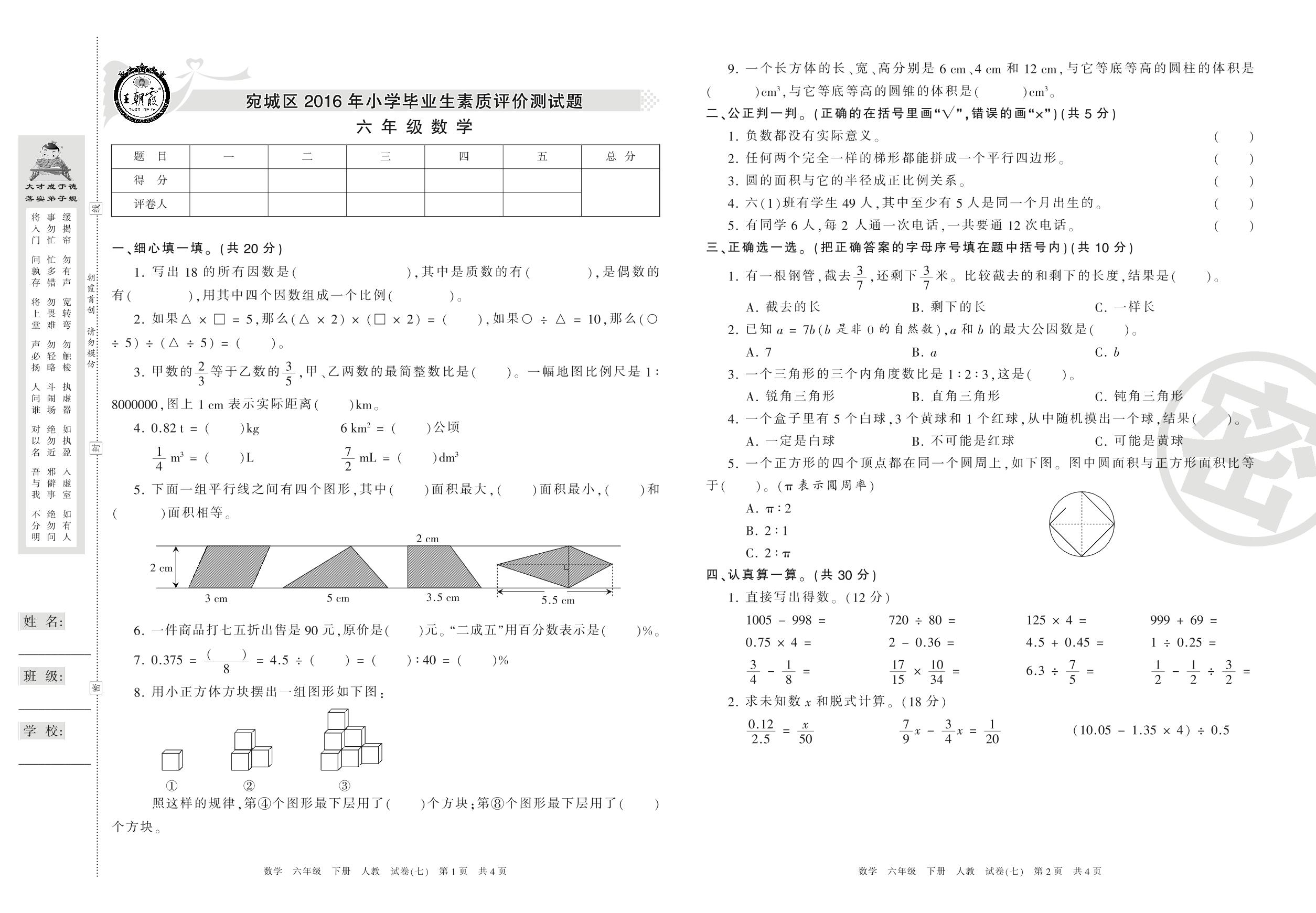 2015-2016学年第二学期南阳市宛城区六年级数学试卷(人教版)【7】