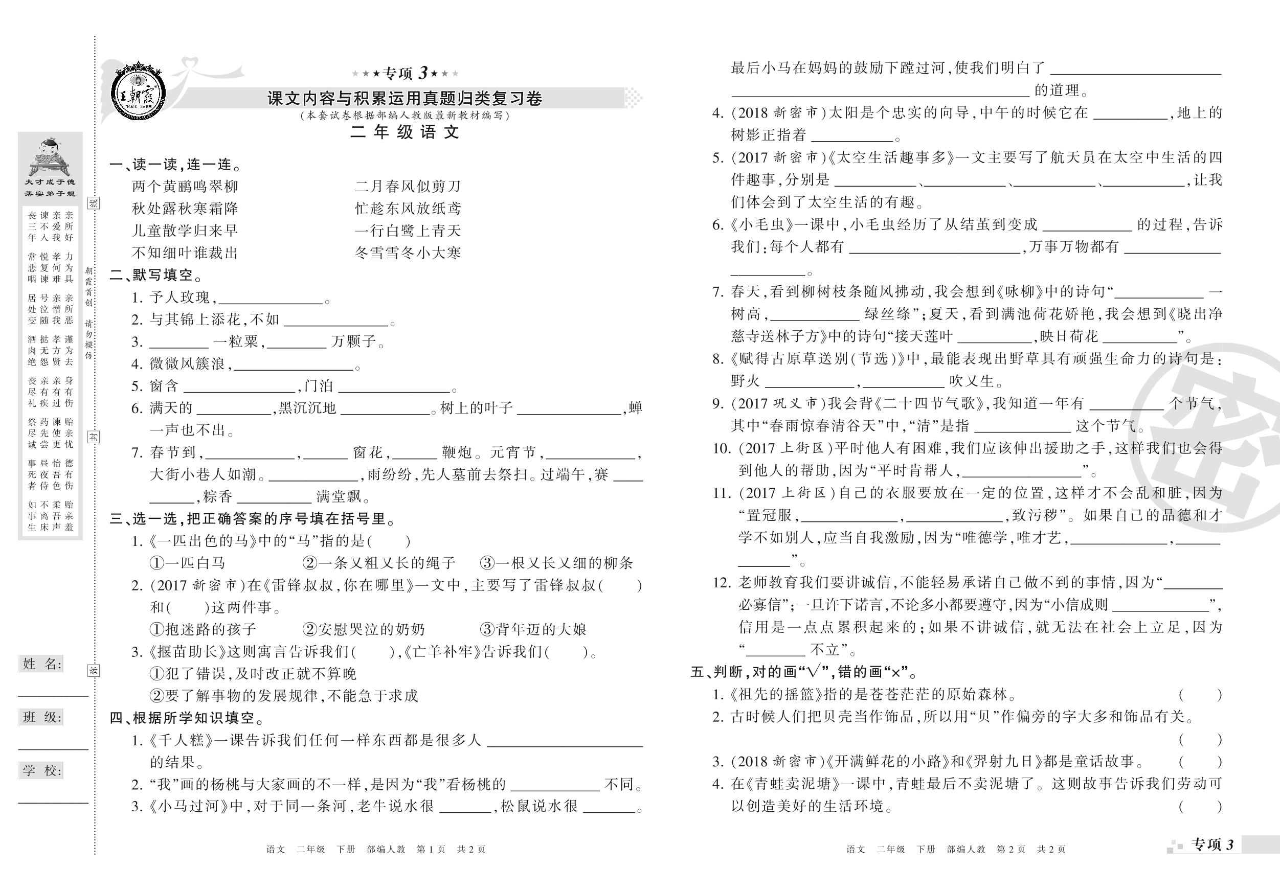 王朝霞期末专项卷——课文内容与积累运用、写话真题归类复习二年级下册语文(人教版)_R21080172745【0】