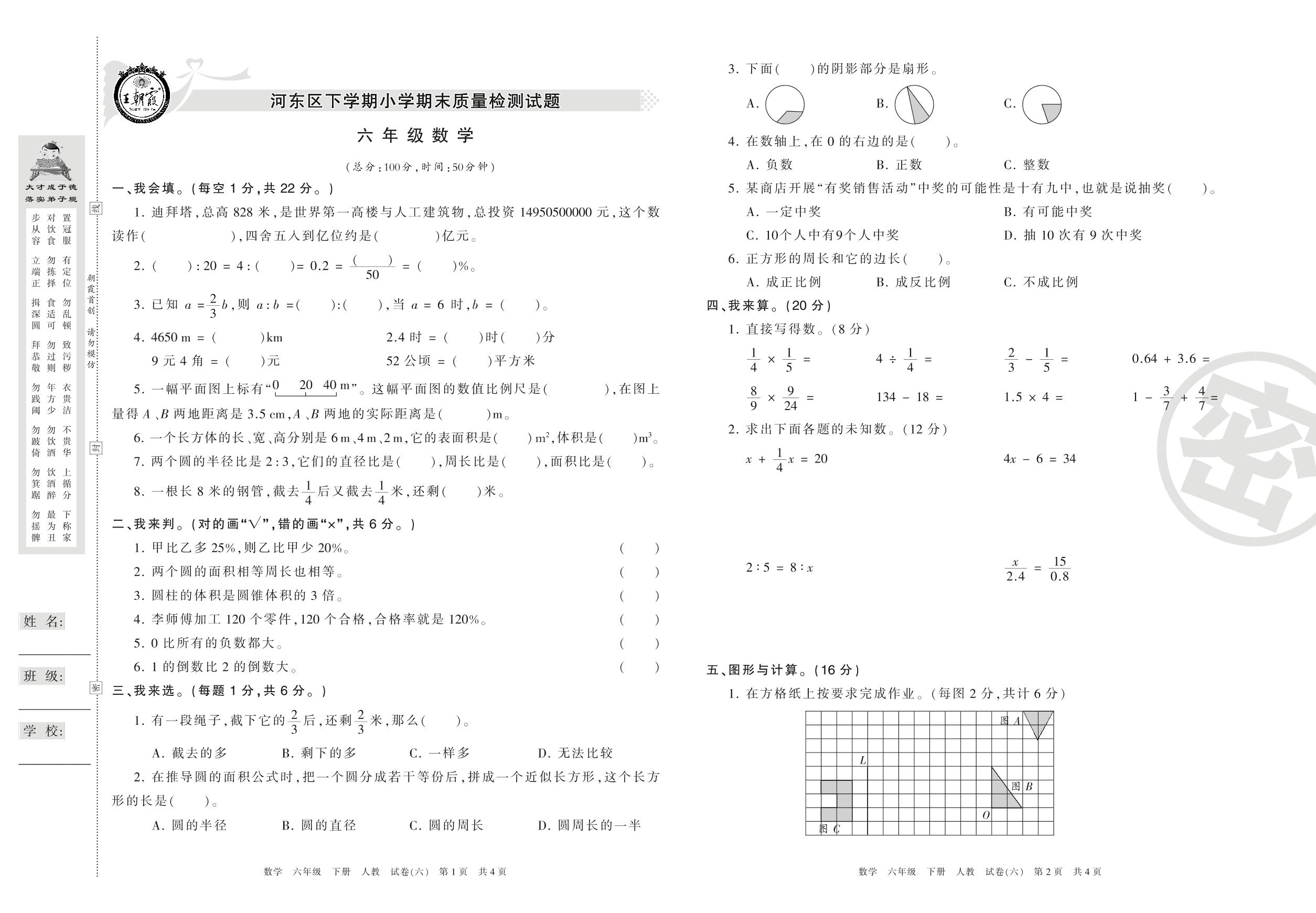2015-2016学年第二学期临沂市河东区六年级数学试卷(人教版)【6】