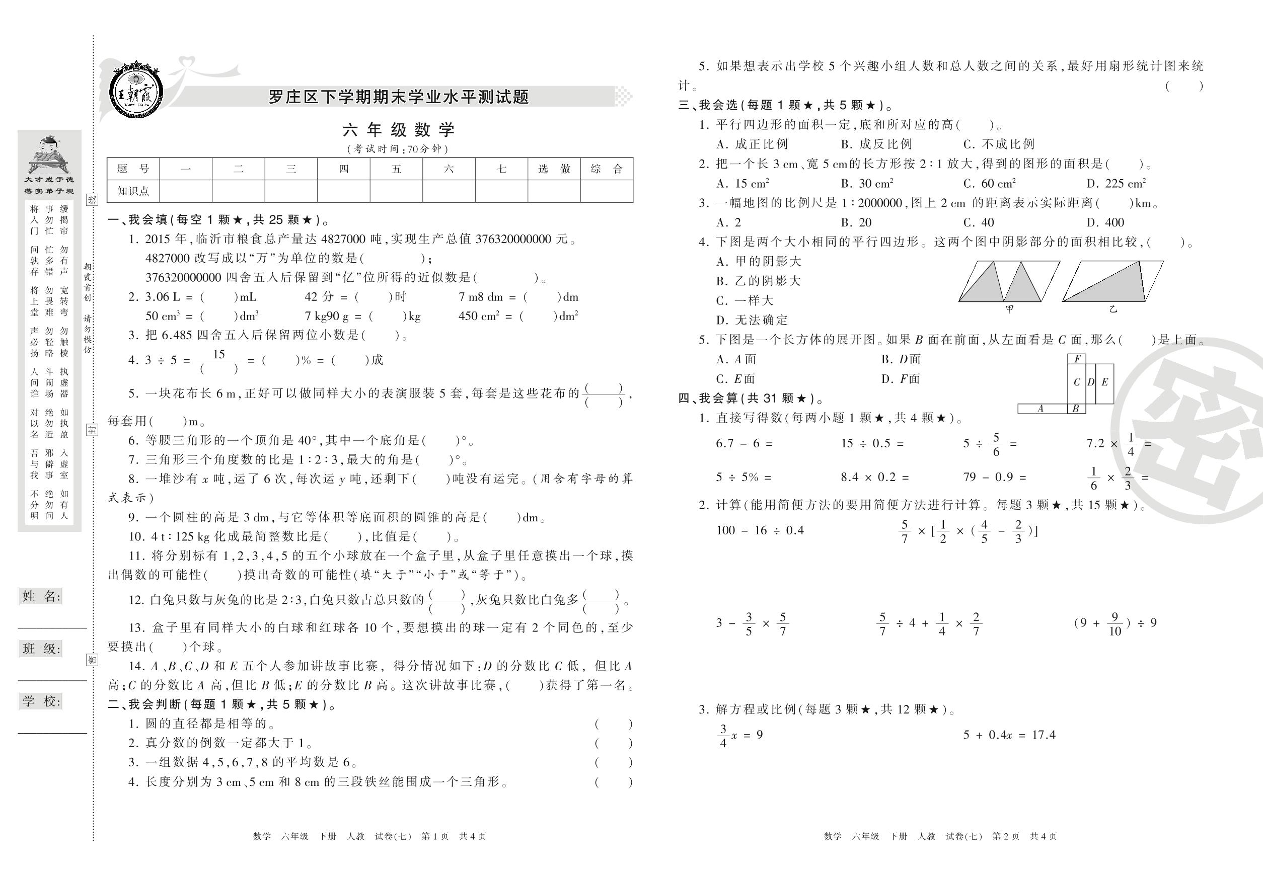 2015-2016学年第二学期临沂市罗庄区六年级数学试卷(人教版)【7】
