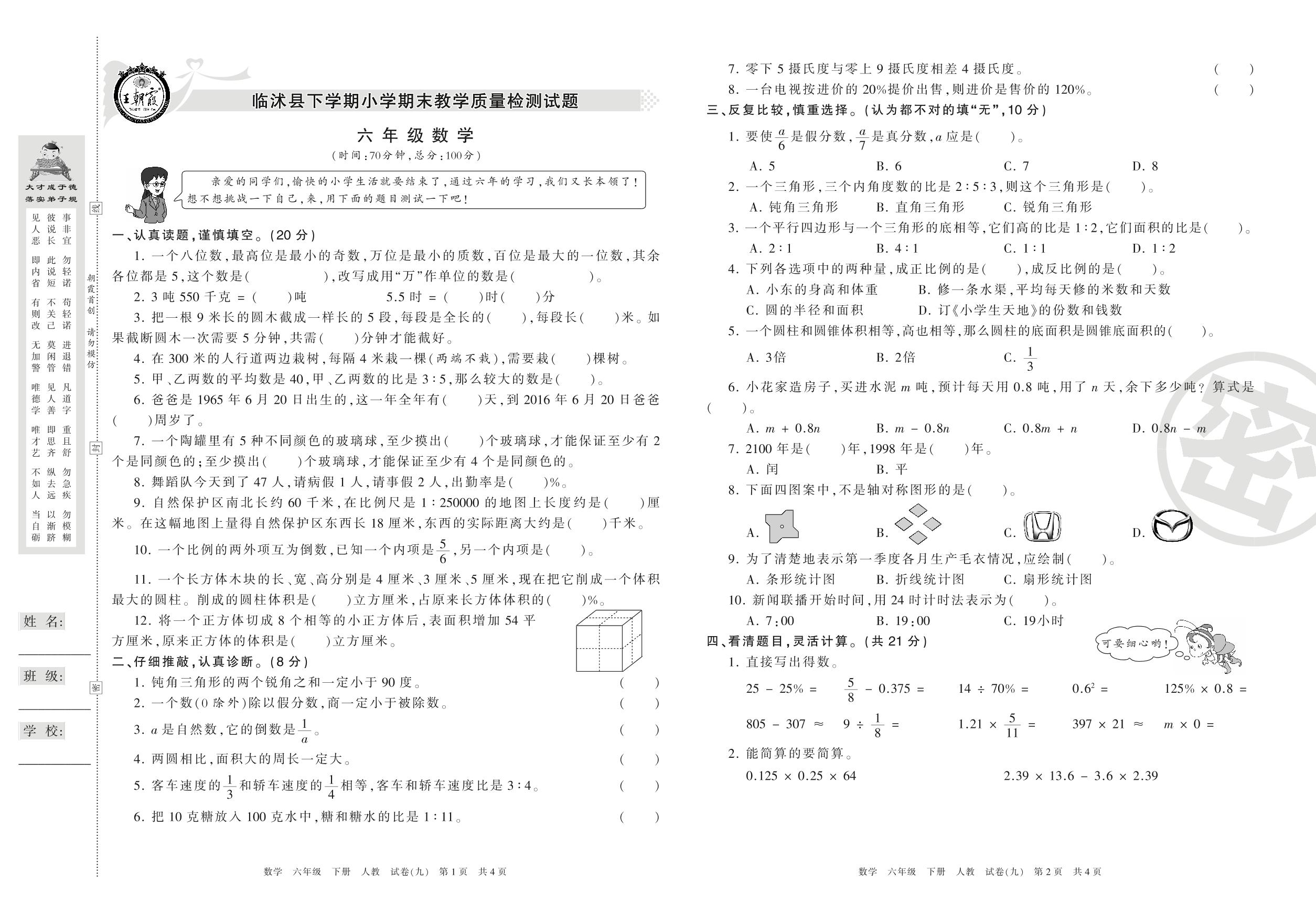 六年级数学人教版下册期末卷