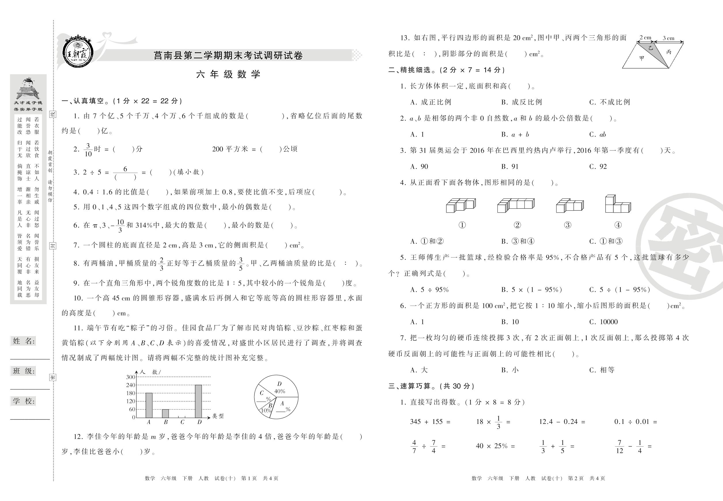 2015-2016学年第二学期临沂市莒南县六年级数学试卷(人教版)【10】