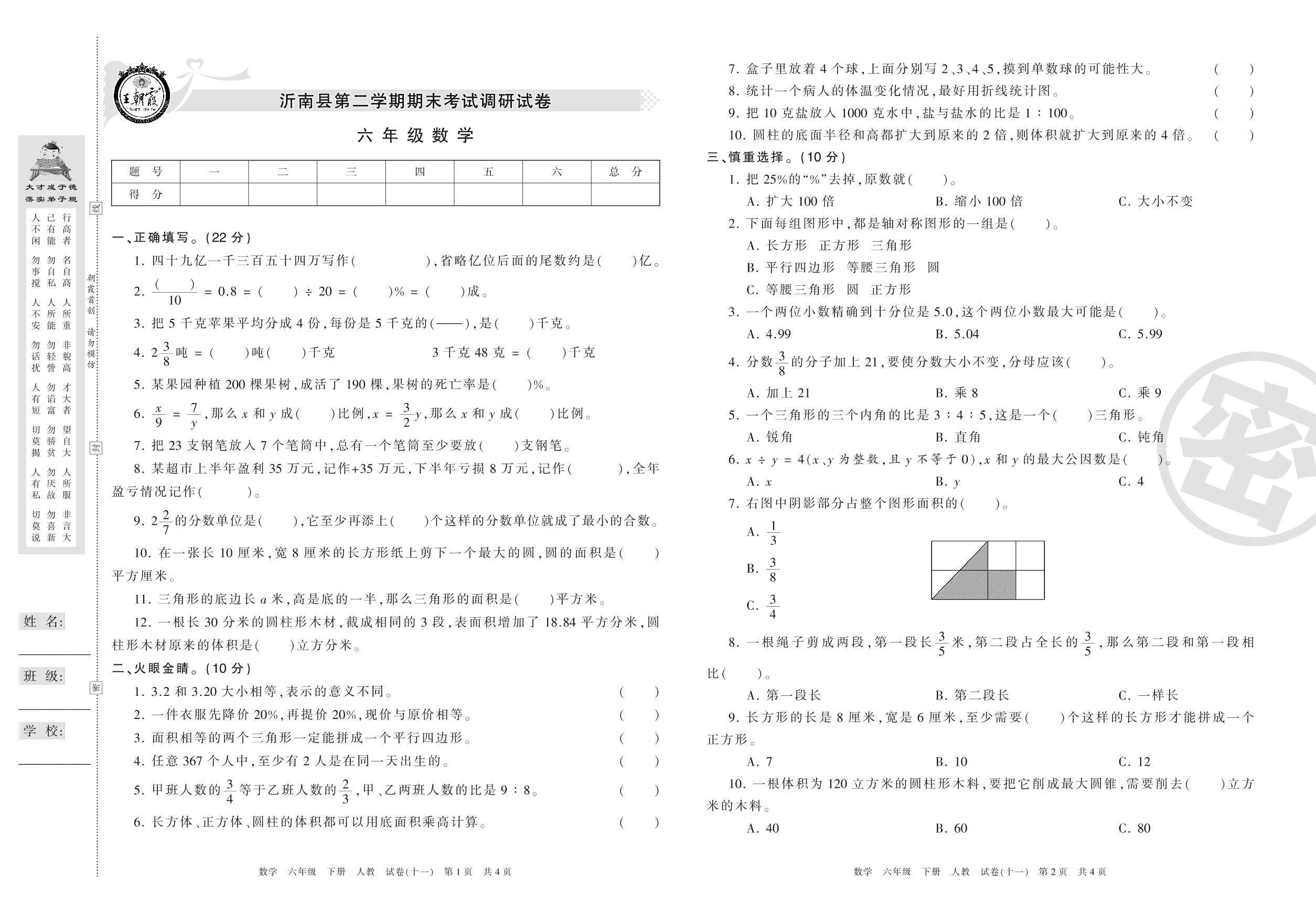 2015-2016学年第二学期临沂市沂南县六年级数学试卷(人教版)【11】