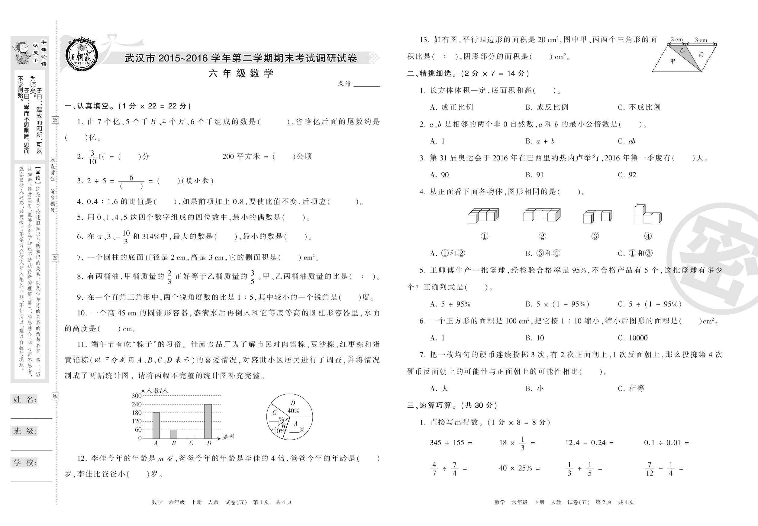 2015-2016学年第二学期武汉市六年级数学试卷(人教版)【5】