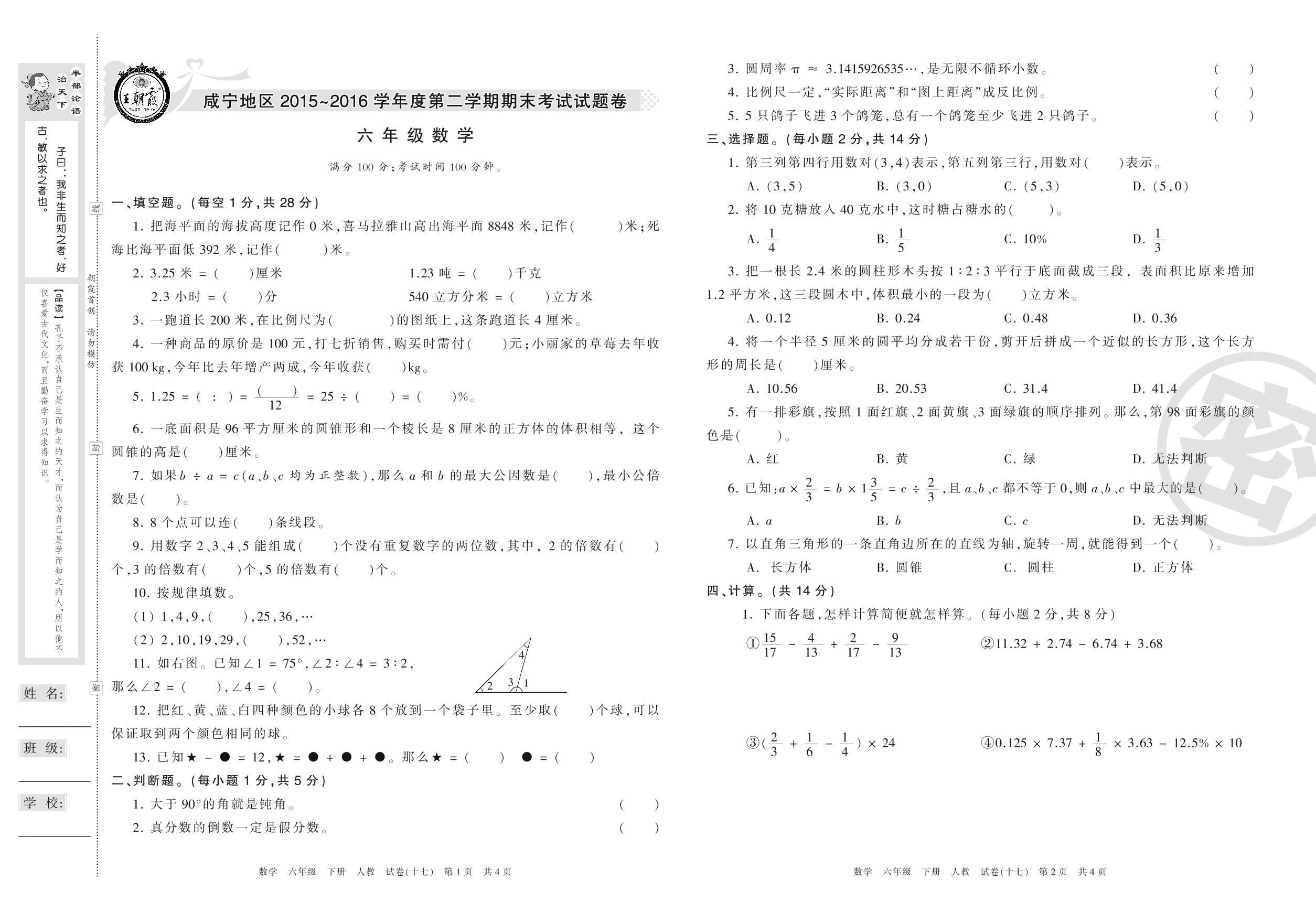2015-2016学年第二学期咸宁市咸宁地区六年级数学试卷(人教版)【17】