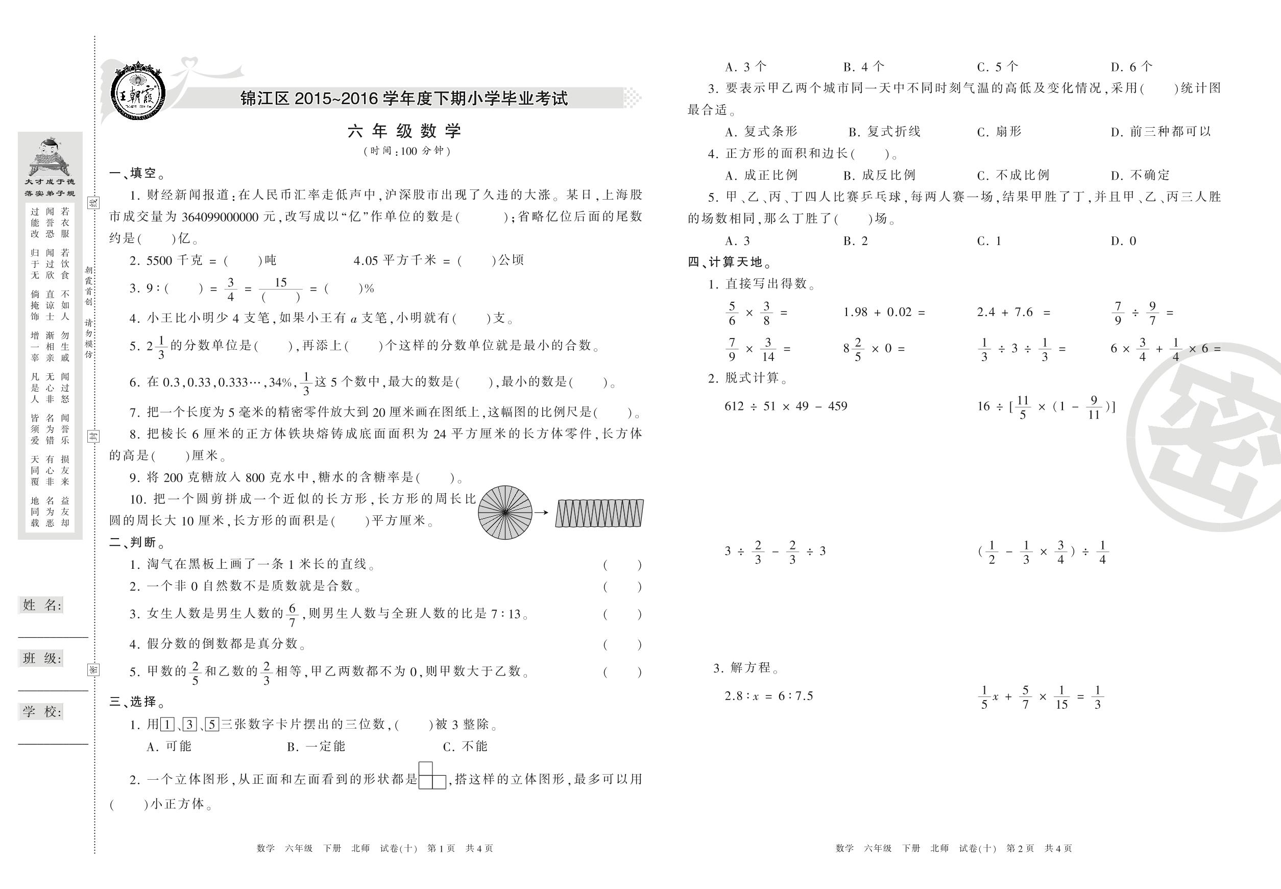 2015-2016学年第二学期成都市锦江区六年级数学试卷(北师版)【10】
