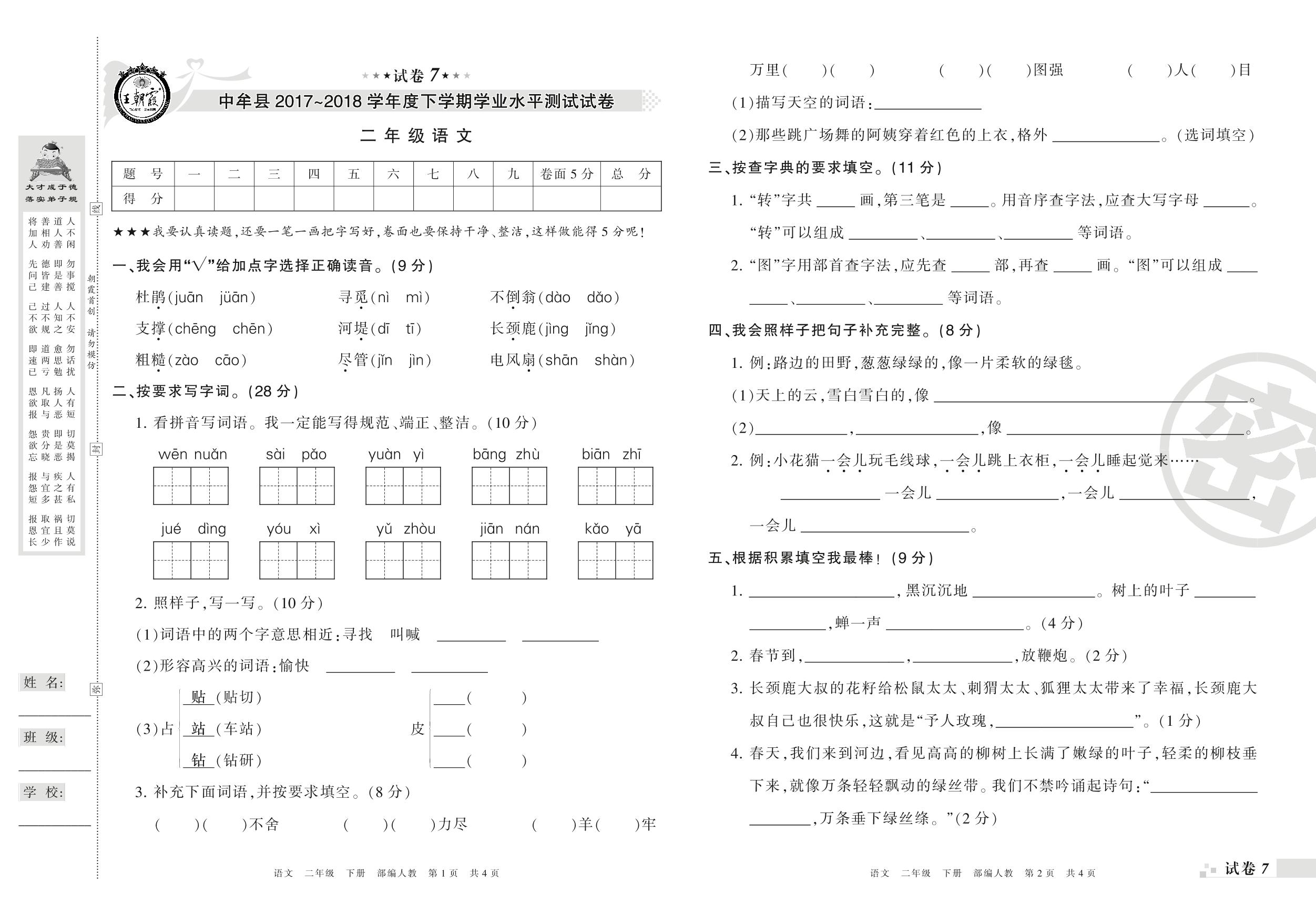 2017-2018学年第二学期郑州市中牟县二年级语文试卷(人教版)【7】