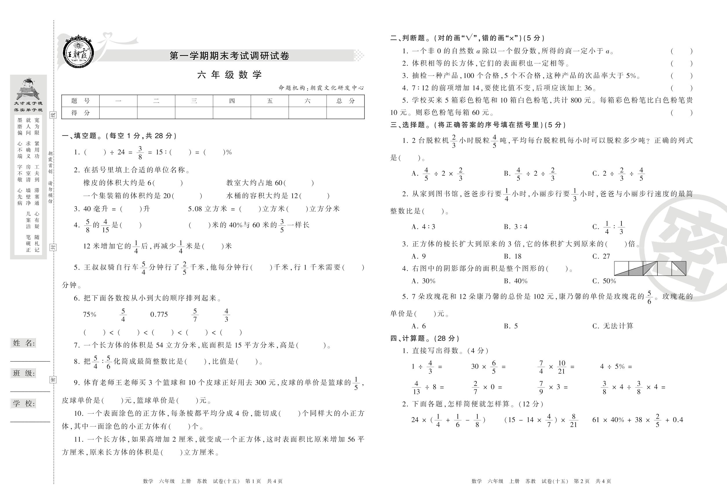 王朝霞期末调研卷六年级上册数学(苏教版)【15】