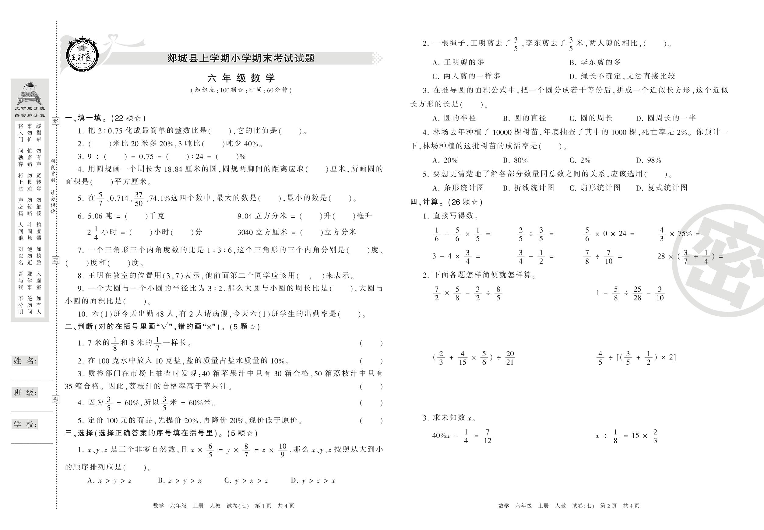 六年级数学人教版上册期末卷