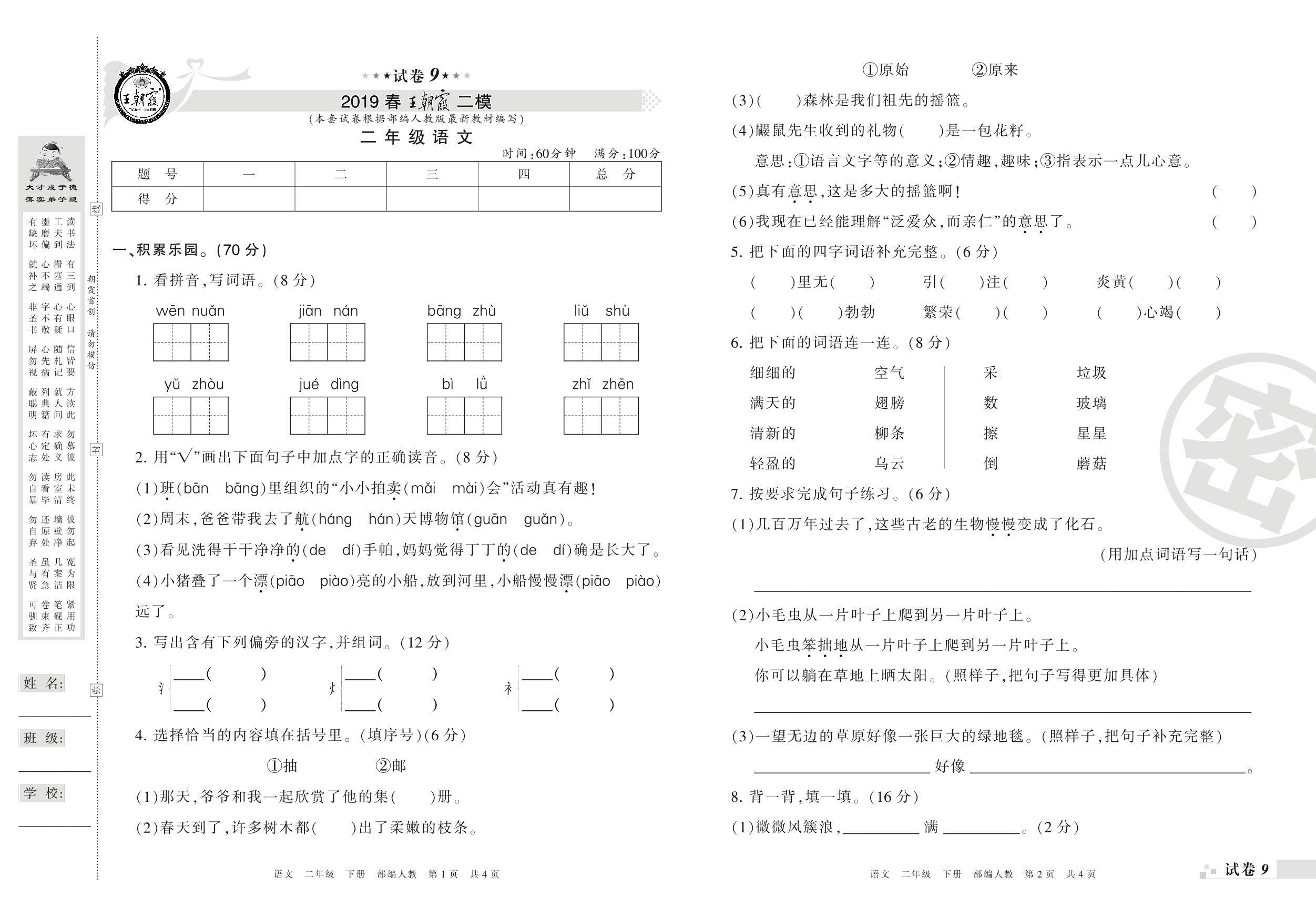 王朝霞期末模拟卷二年级下册语文(人教版)_R21080172815【9】