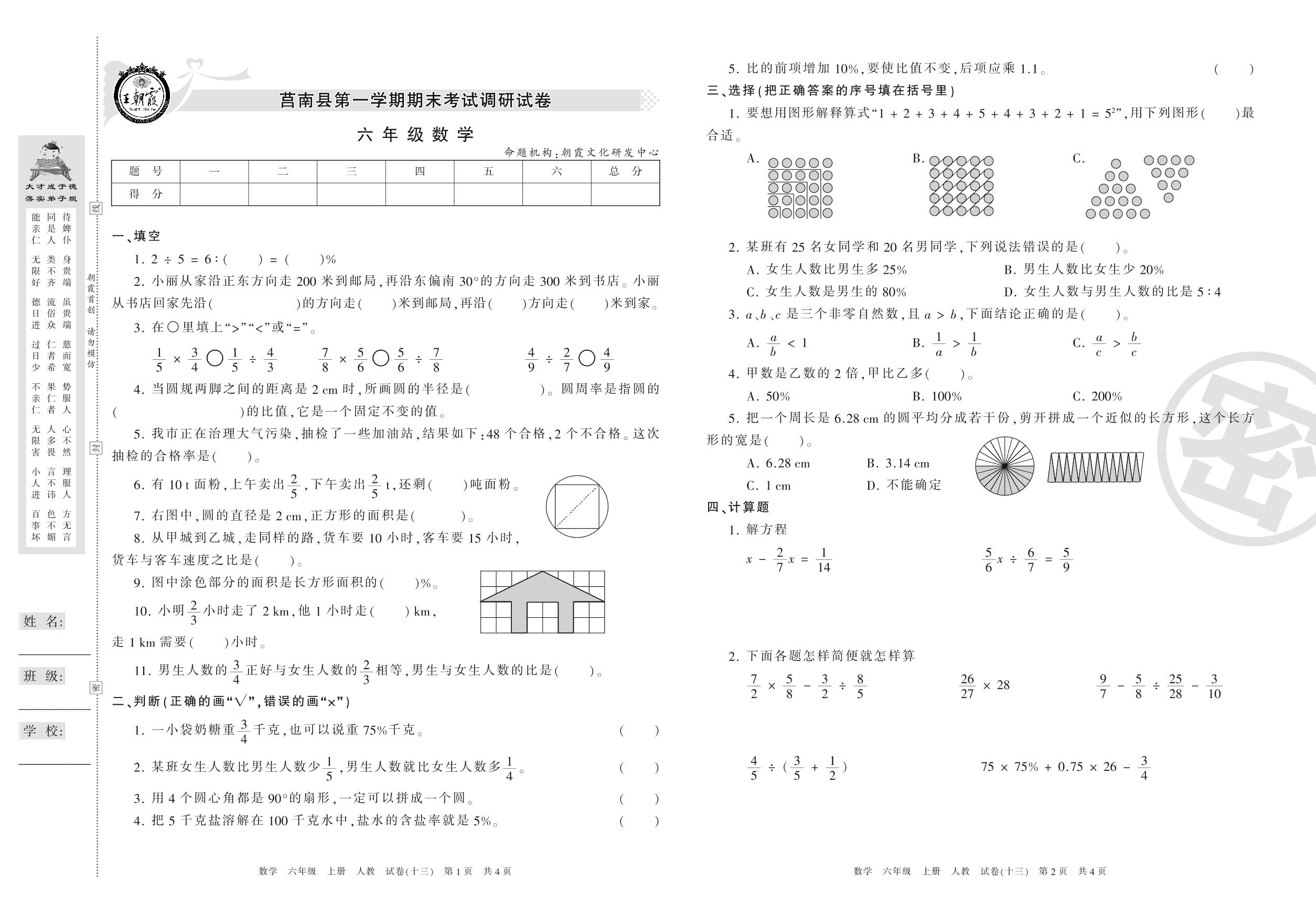 2016-2017学年第一学期临沂市莒南县六年级数学试卷(人教版)【13】