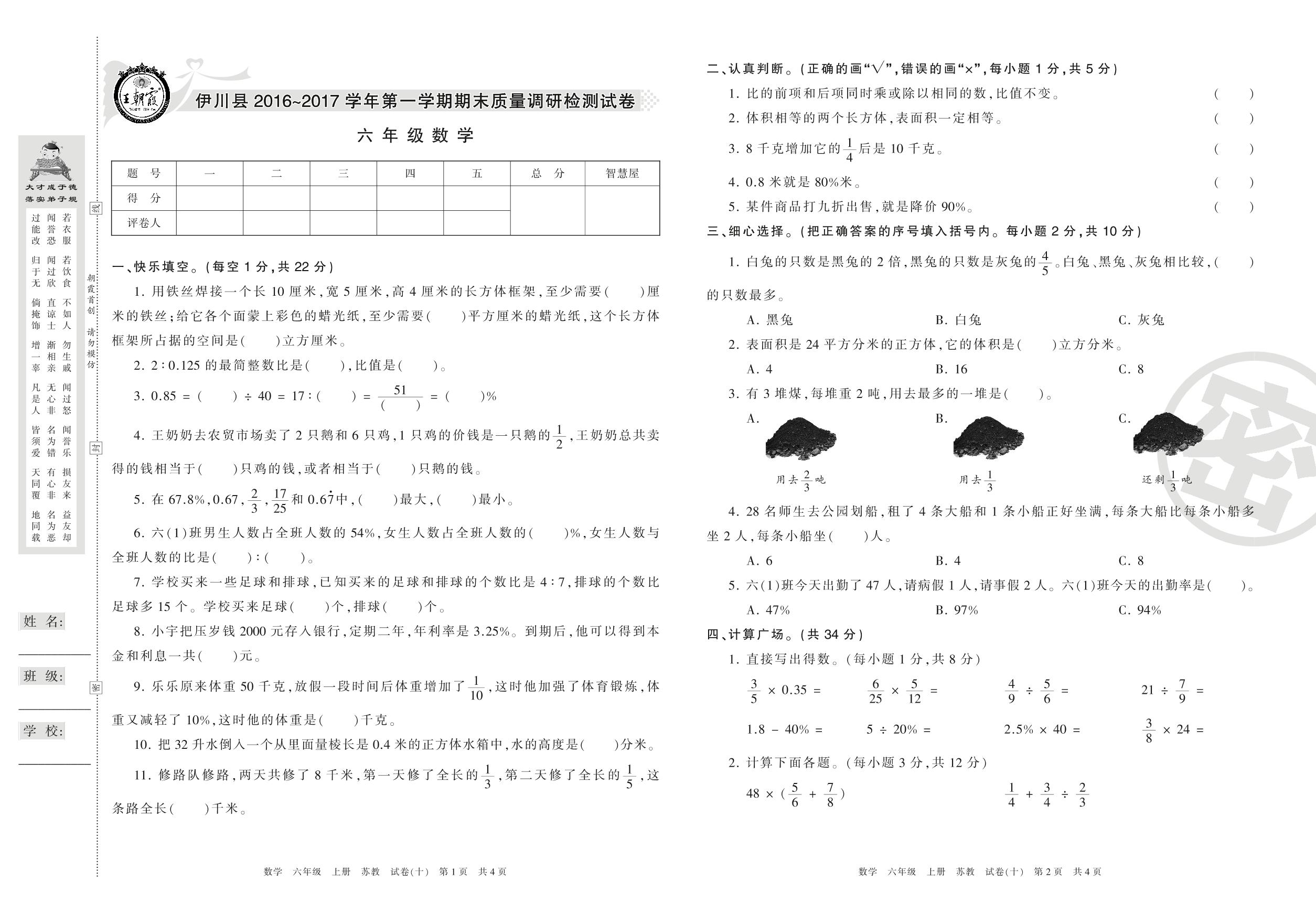 2016-2017学年第一学期洛阳市伊川县六年级数学试卷(苏教版)【10】