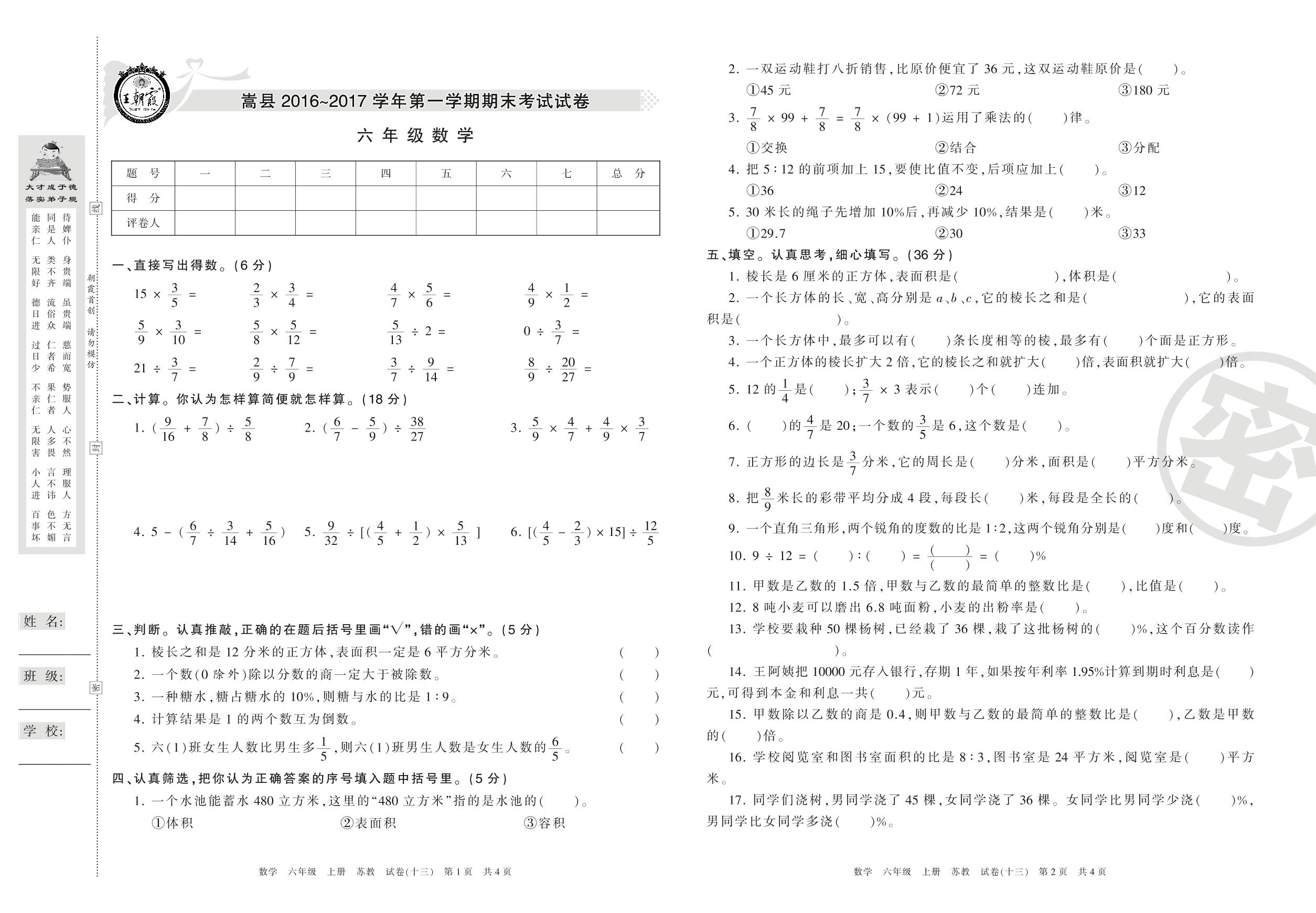 2016-2017学年第一学期洛阳市嵩县六年级数学试卷(苏教版)【13】