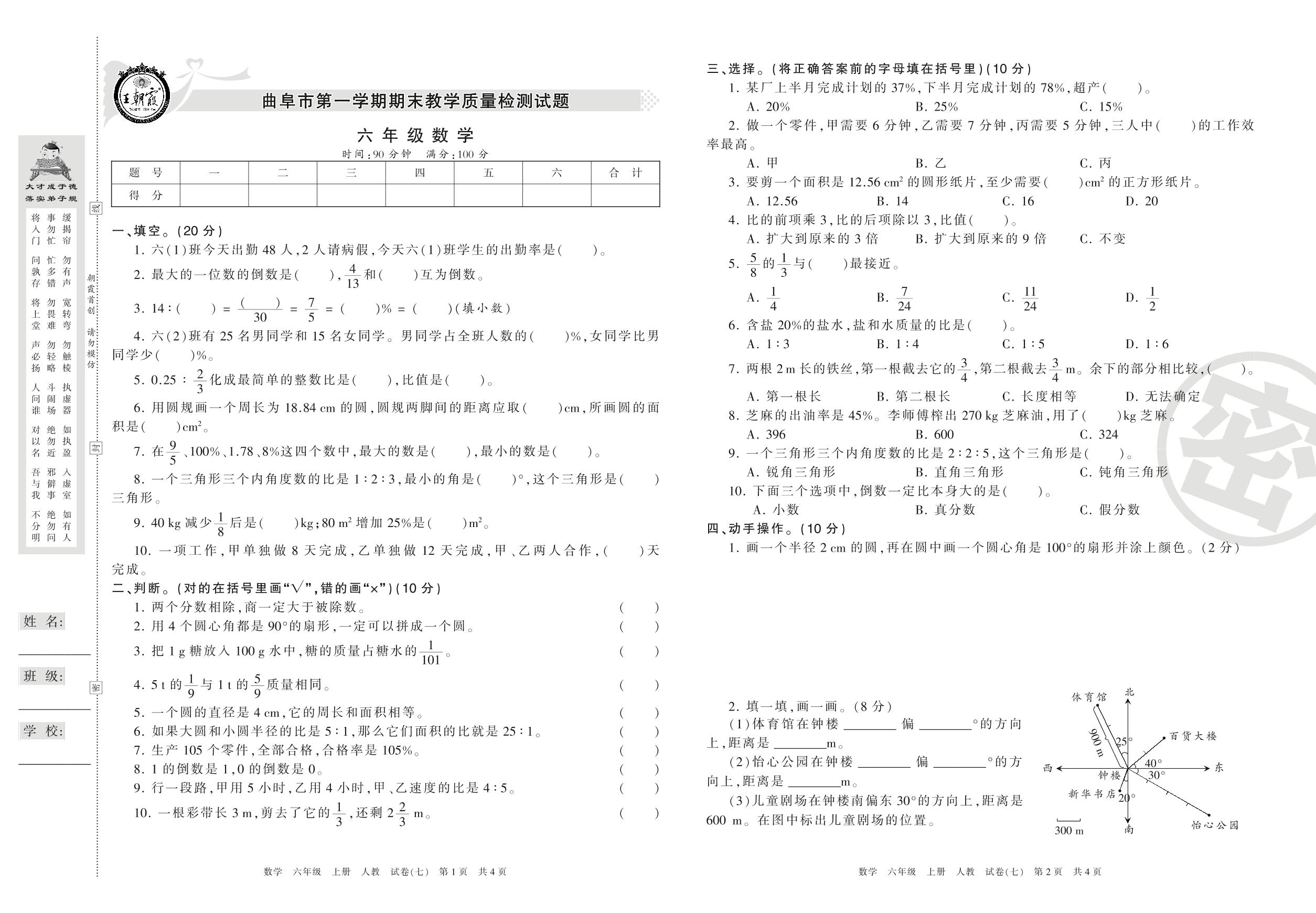 2016-2017学年第一学期曲阜市六年级数学试卷(人教版)【7】