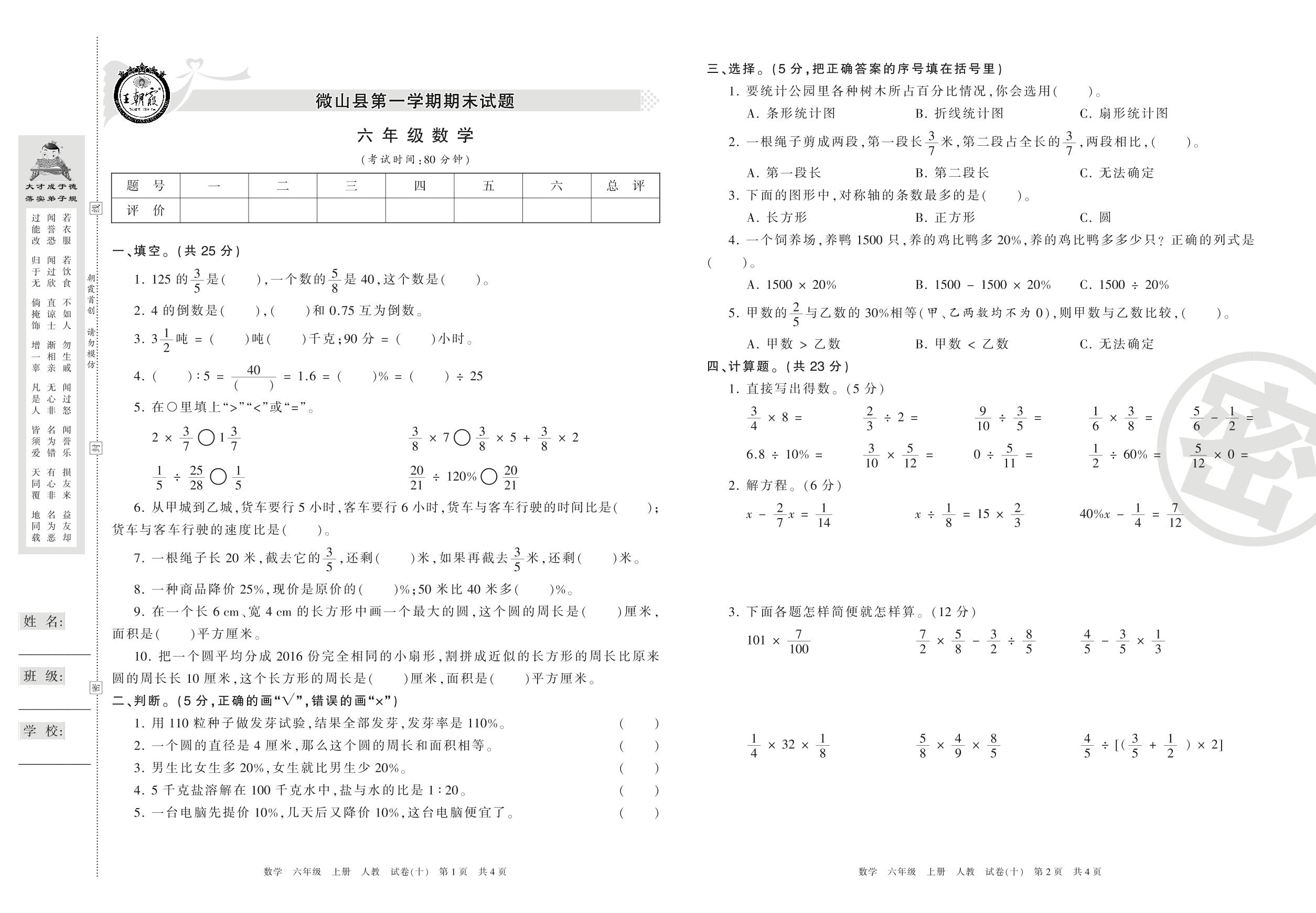 2016-2017学年第一学期济宁市微山县六年级数学试卷(人教版)【10】