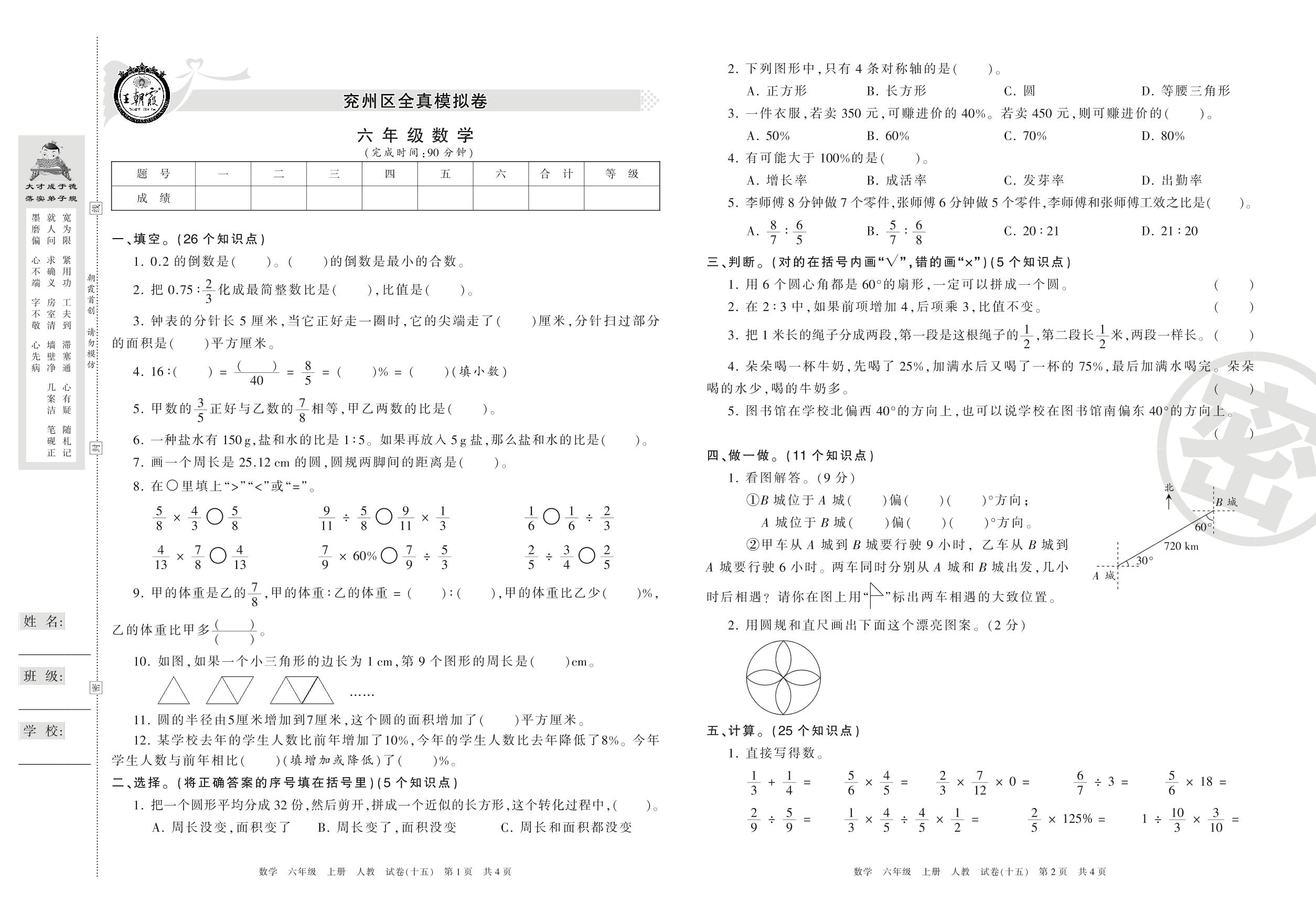 2016-2017学年第一学期济宁市兖州区六年级数学试卷(人教版)【15】